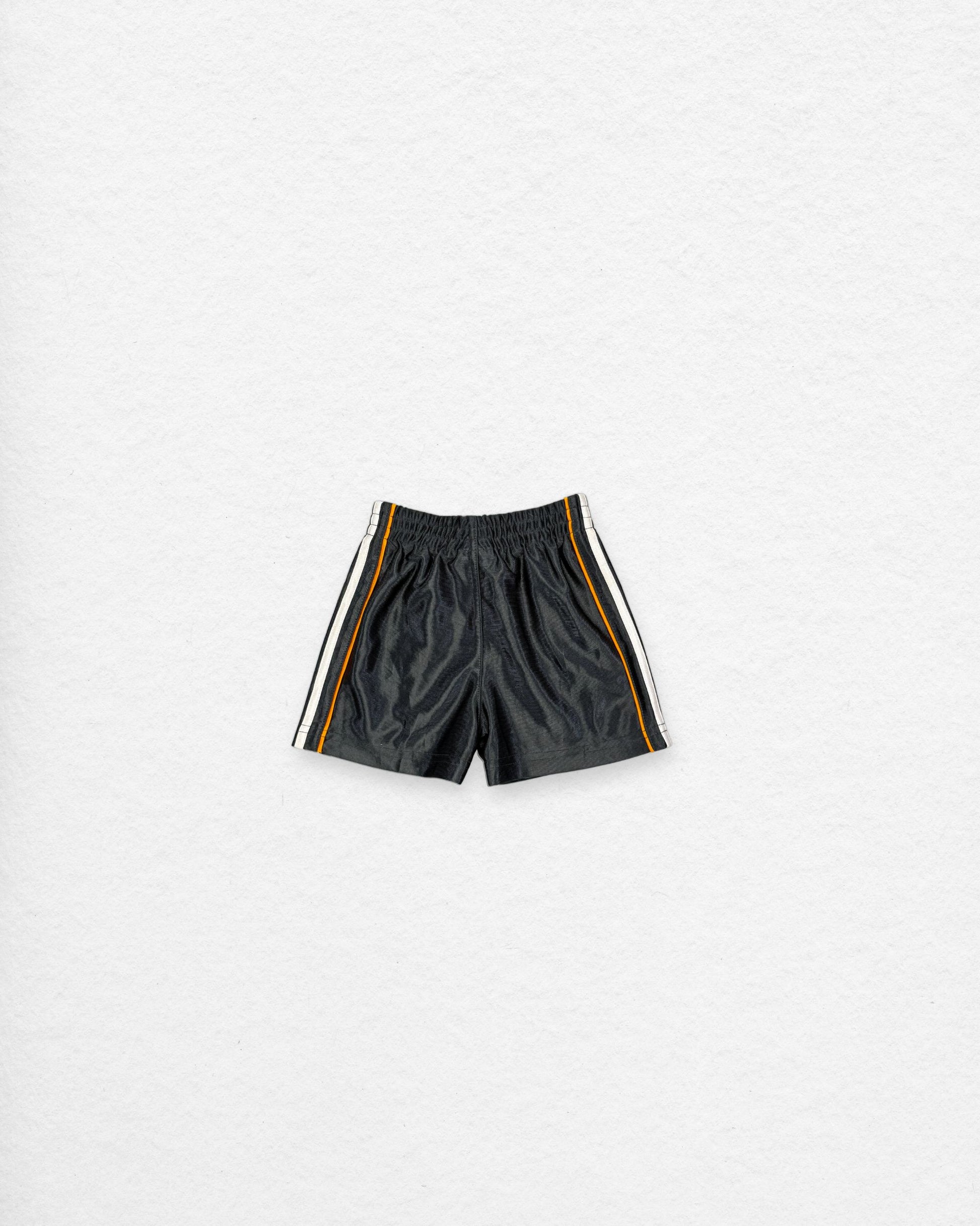 A pair of vintage Adidas baby shorts in shiny black nylon with orange piping and the classic three white side stripes. Lightweight and comfortable with an elastic waist, perfect for everyday wear or styled with retro tees.
