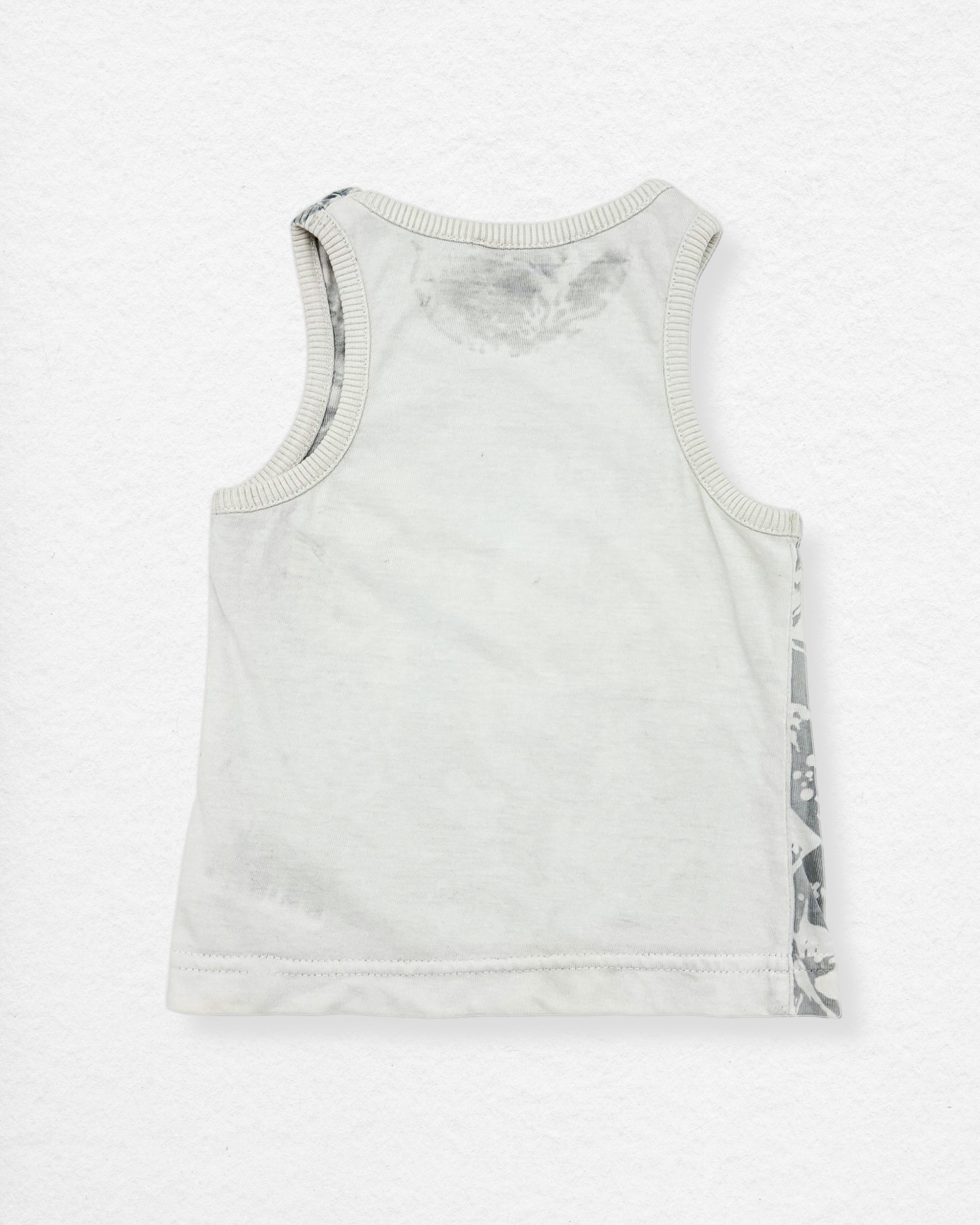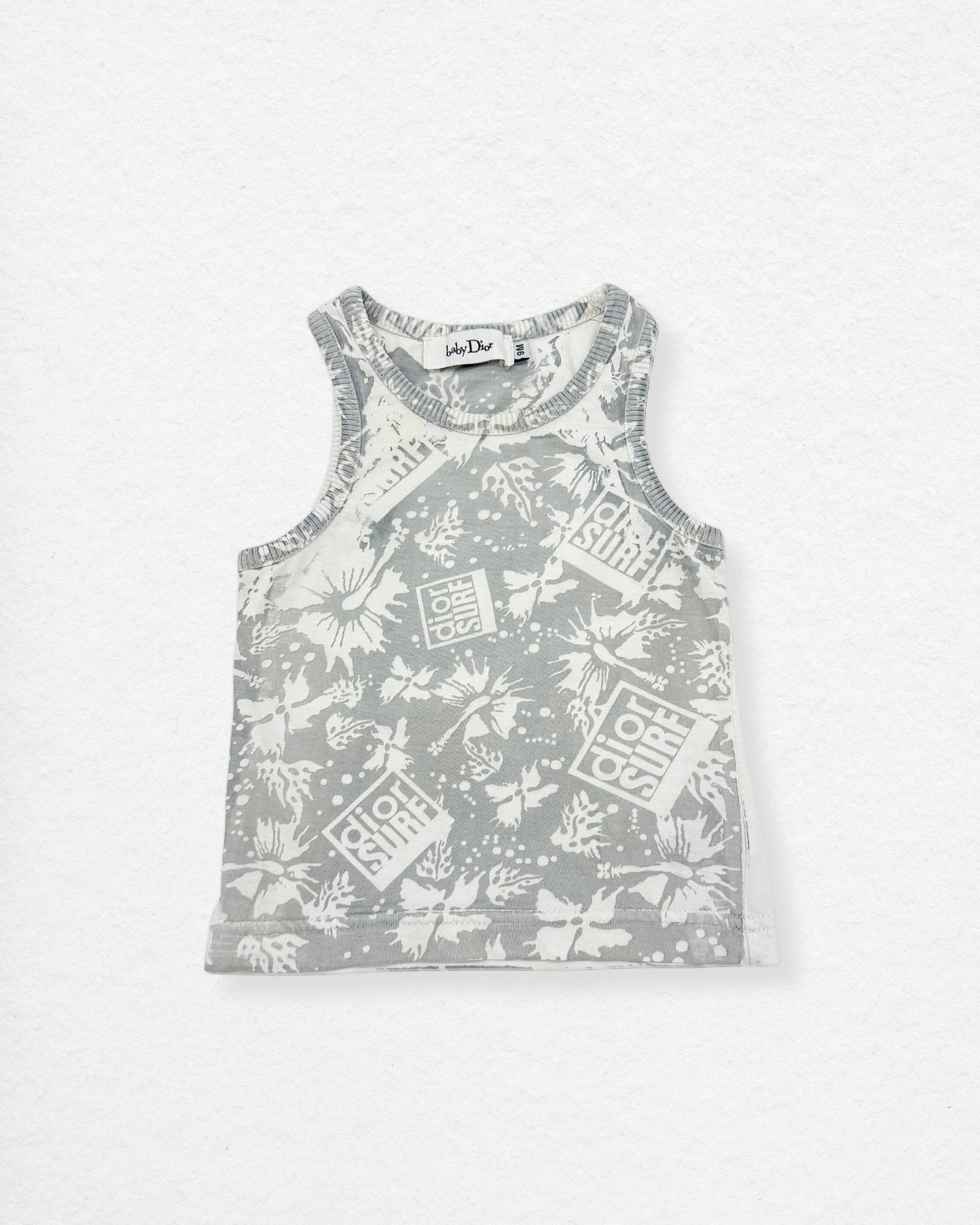 An exceptionally rare vintage Baby Dior piece from the coveted “Dior Surf” line. This sleeveless top features an all-over surf graphic print in soft grey and white with ribbed trim. A true collector’s item - this is a standout addition to any designer kidswear archive.