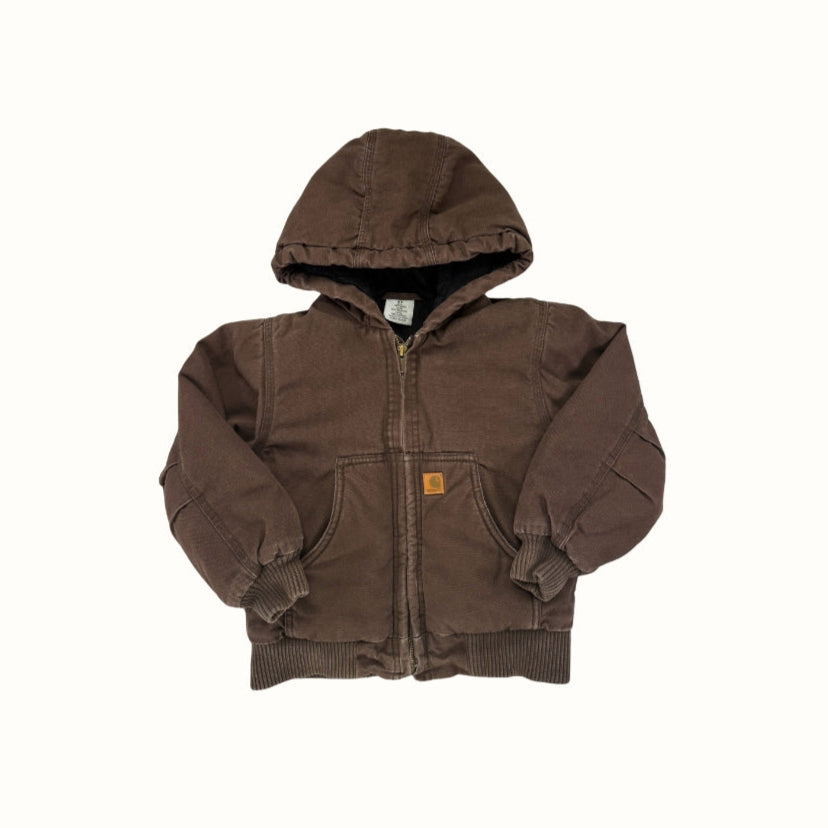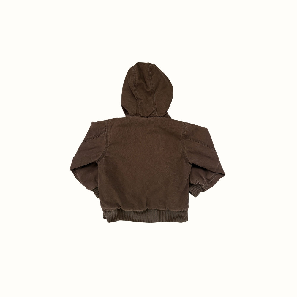 Durable brown Carhartt workwear jacket designed for warmth and comfort. Features a soft quilted lining, ribbed cuffs and hem, and the iconic Carhartt patch logo at the pocket.