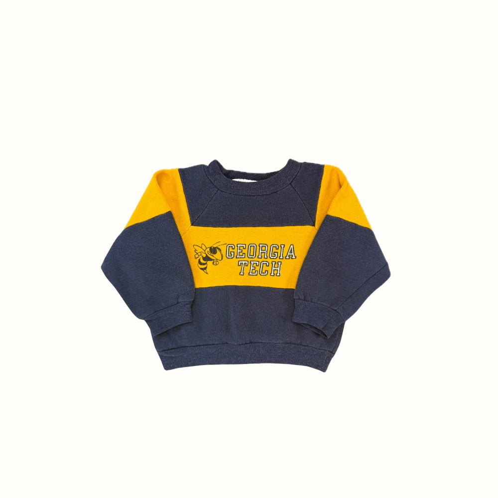 Collegiate-style navy and gold colour-block crewneck sweatshirt featuring “Georgia Tech” lettering and the school’s Yellow Jackets mascot graphic at the chest.