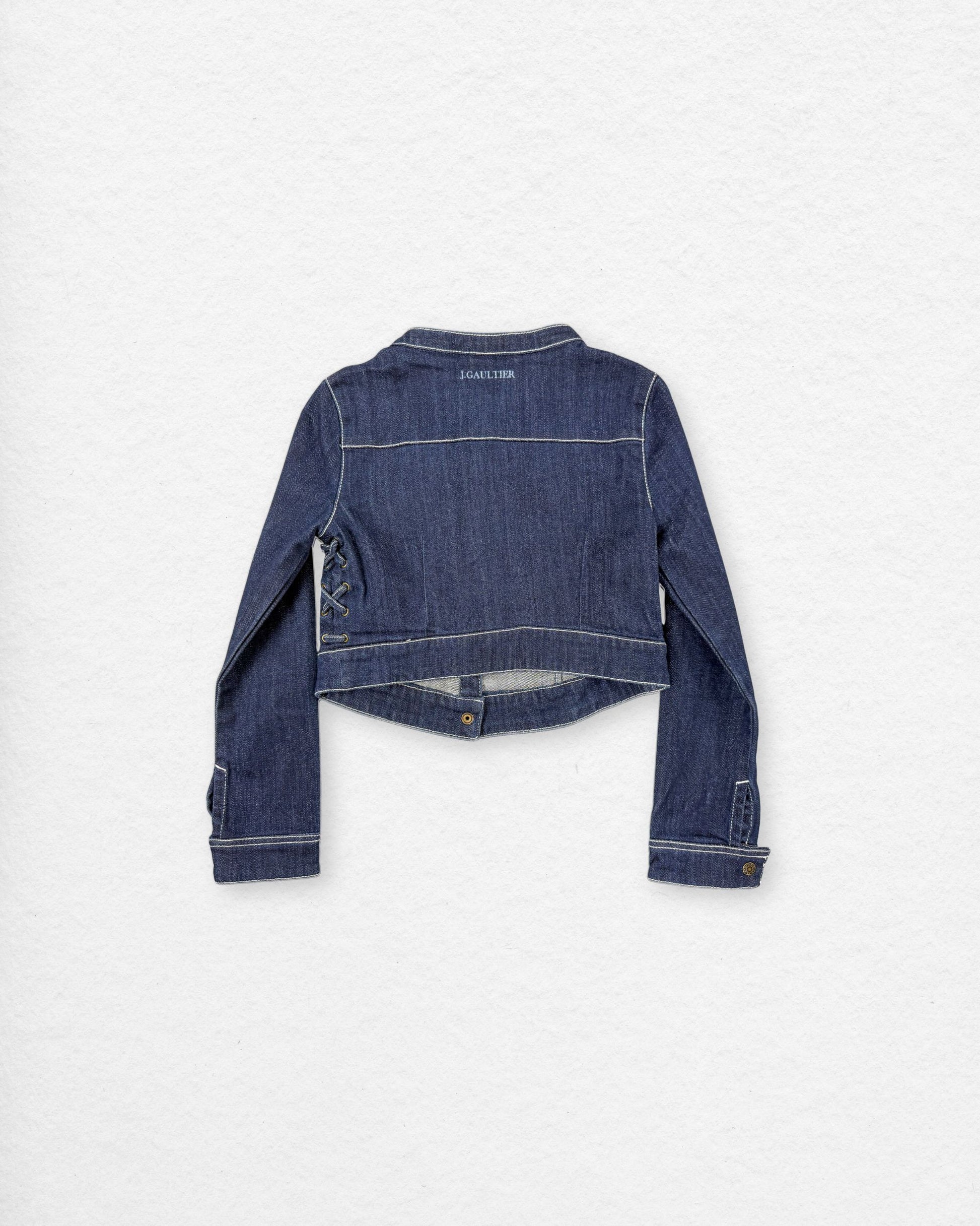 Rare Jean Paul Gaultier Junior denim jacket featuring a modern cropped cut and signature corset-style lace-up detailing at the sides. Designed in dark indigo denim with contrast stitching, structured tailoring, and embossed metal hardware. A collector’s piece from the early 2000s era.
