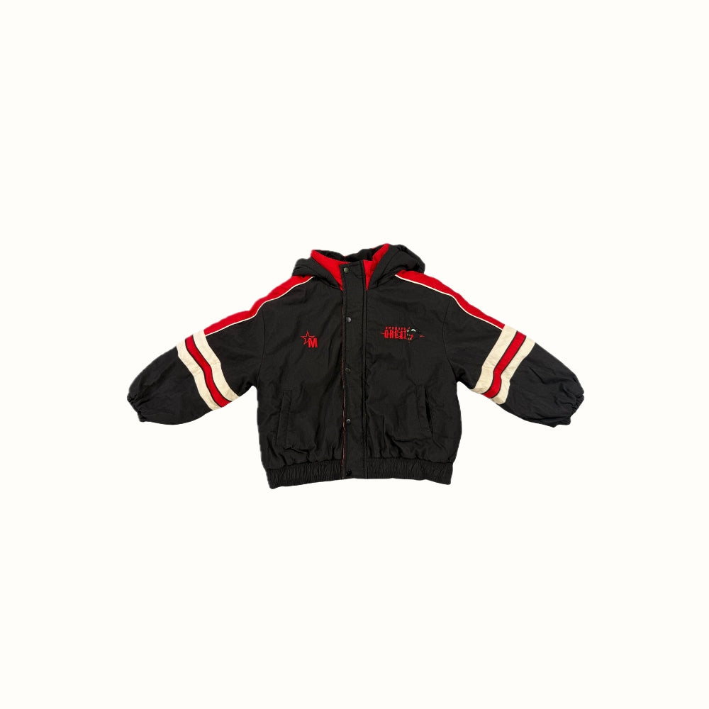 Retro-style black windbreaker jacket with bold red and white sleeve stripes and embroidered logos at the chest. Features a zip front, snap button placket, and attached hood for extra protection.