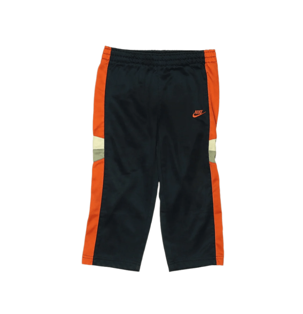 Vintage Nike track pants in black with orange and beige side paneling. Features an embroidered orange Nike Swoosh on the front and an elastic waistband. Made from smooth polyester with a relaxed fit.