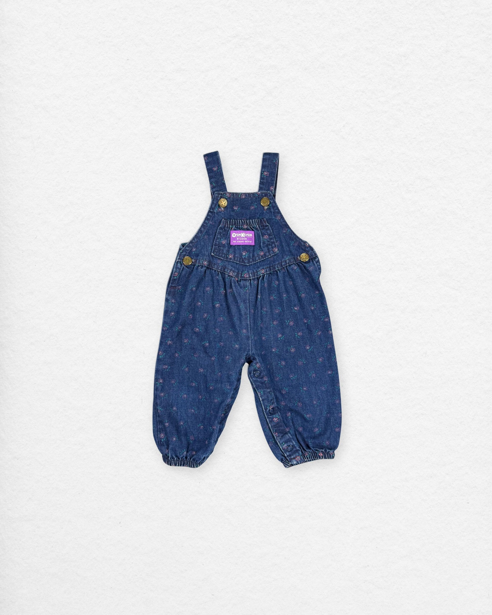 Sweet and timeless — these vintage OshKosh overalls feature a subtle all-over floral print on soft mid-wash denim. They have the classic front bib pocket with the purple “The Genuine Article” tag and brass button hardware, complete with snap closures along the legs for easy changes. A beautiful piece from the late 1980s to early 1990s era, made in the U.S.A.