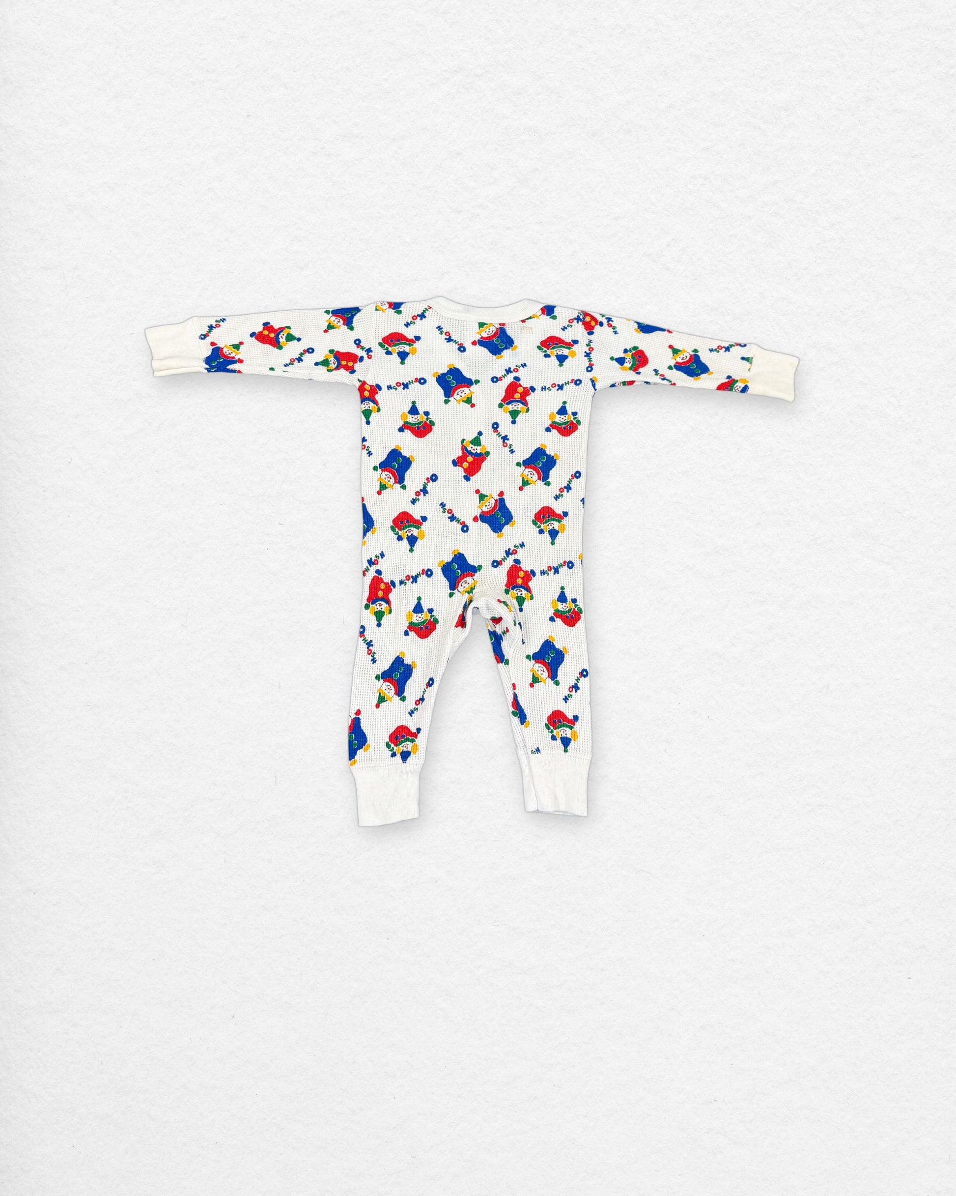 A playful vintage OshKosh thermal onesie covered in bright, colourful clown graphics. Made from soft waffle-knit cotton with a full snap-front closure for easy changes, this cheerful piece is perfect for cosy days and nostalgic wardrobes.