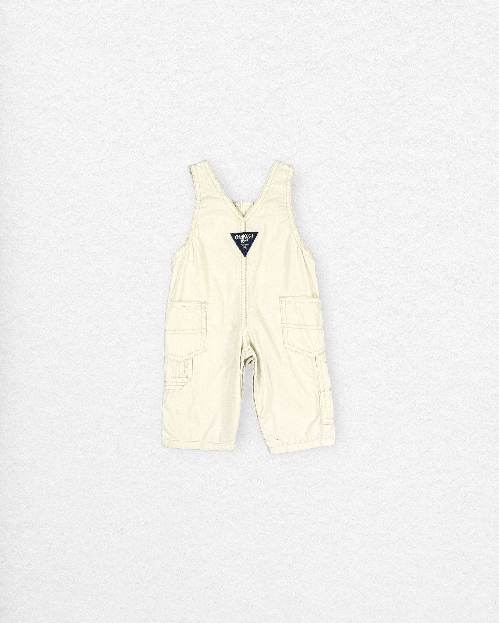 A classic pair of soft cotton OshKosh overalls in an off-white tone. Featuring the navy “The Genuine Article” patch on the chest and signature brass hardware, these overalls are a staple vintage style from the early 2000s. Lightweight and comfortable, perfect for layering across seasons.