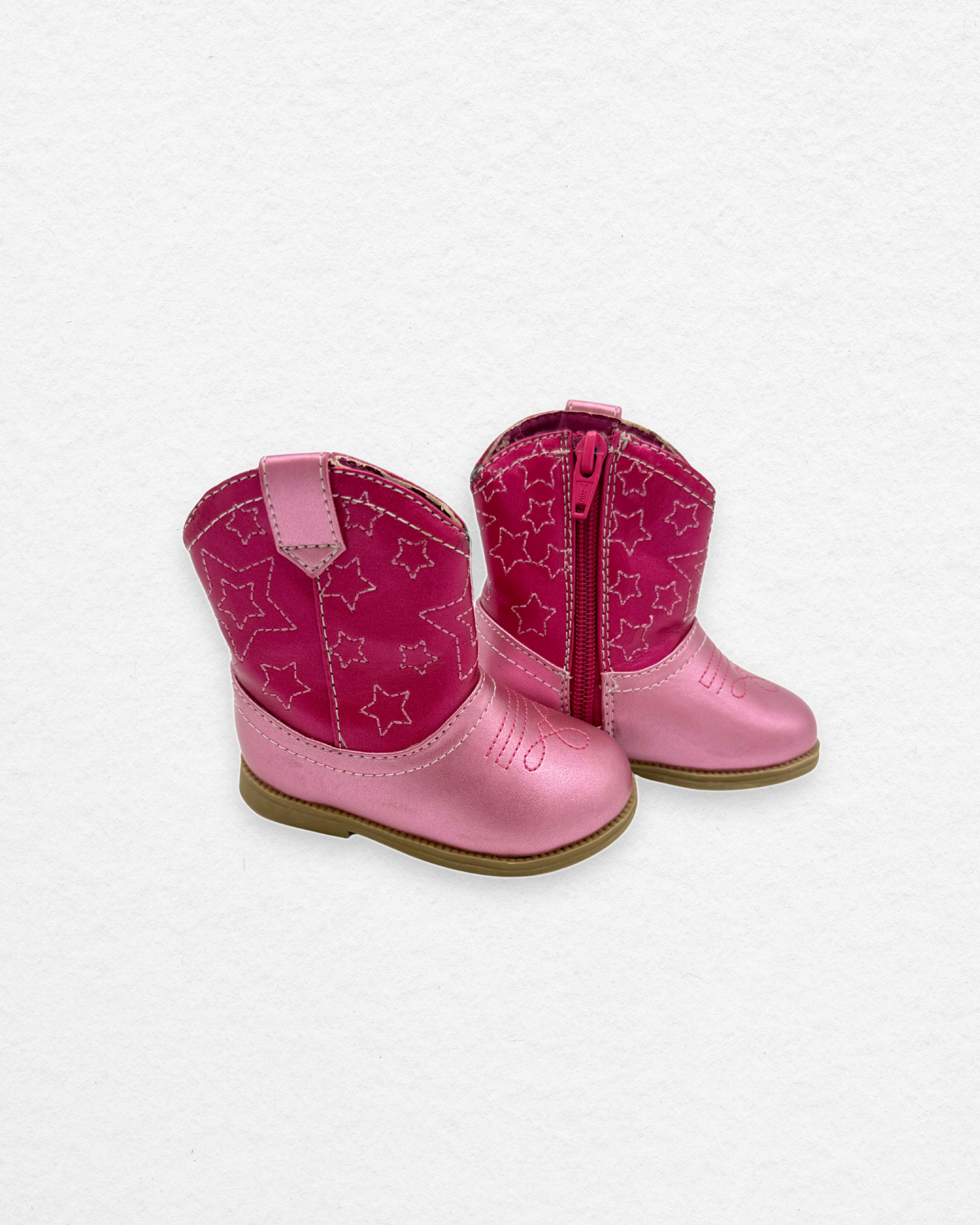 A cute pair of OshKosh pink cowboy-style boots featuring star embroidery and an easy side-zip closure. Soft, flexible soles make them perfect for early walkers. Labelled as a US size 4, which typically fits a 12–18 month toddler.