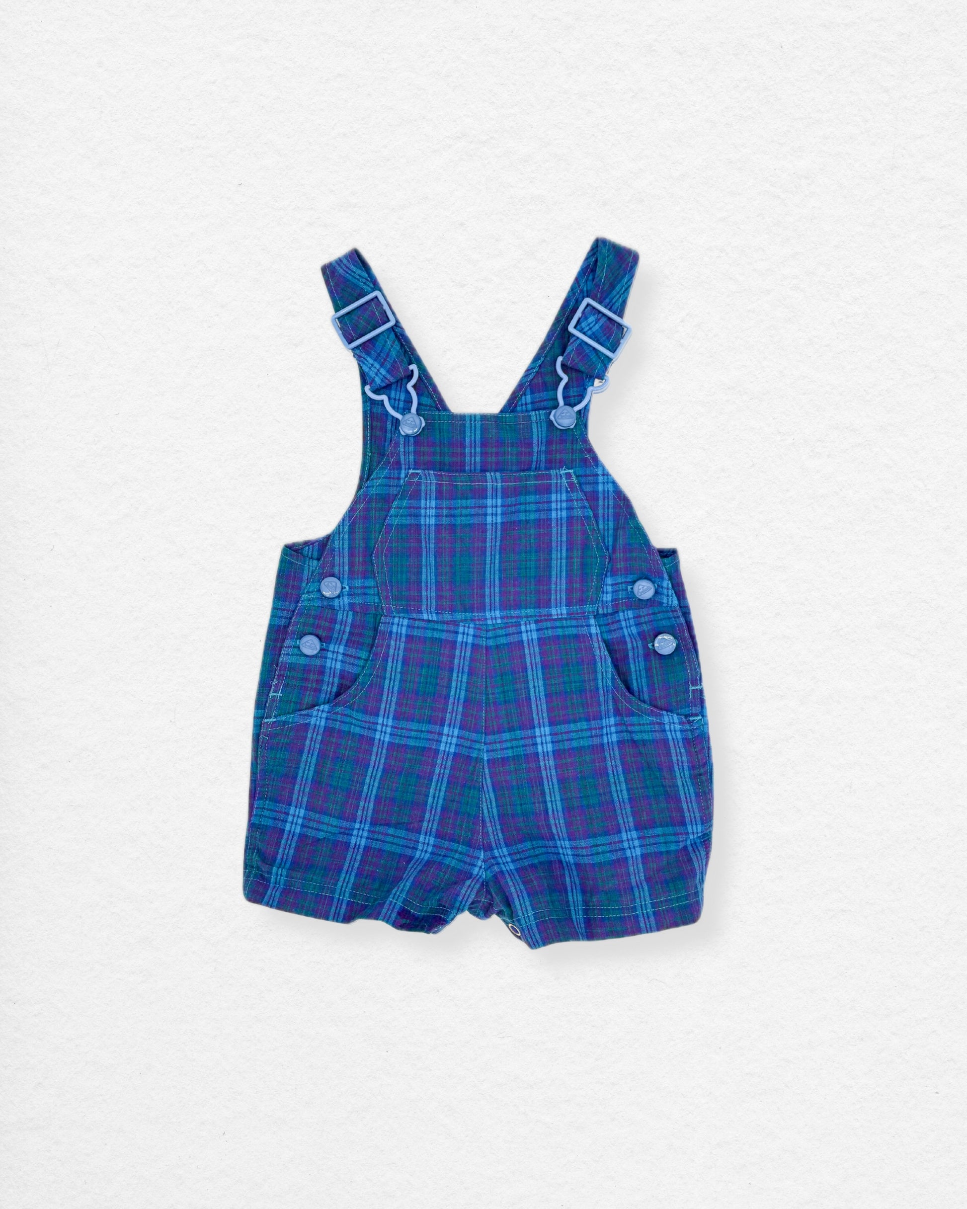 Adorable 1980’s vintage plaid overalls in blue and green tones. Features adjustable straps with metal buckles, button closures at the sides, and front bib pocket. Soft cotton fabric with elastic leg openings for comfort and easy wear.