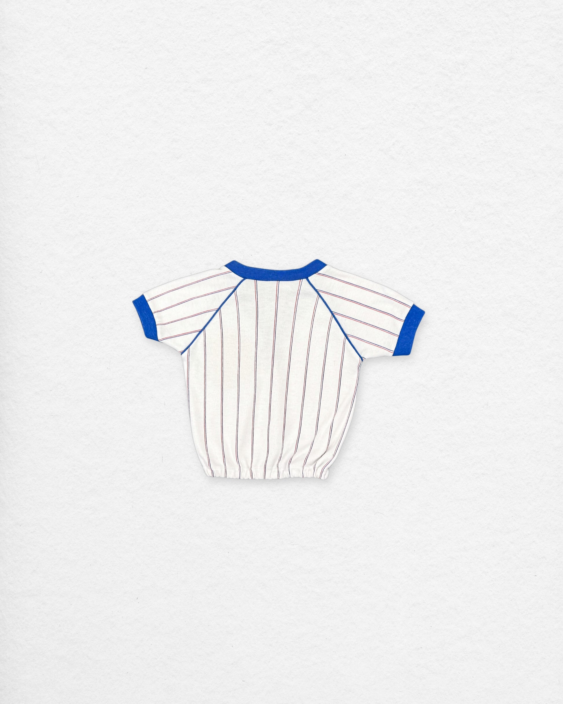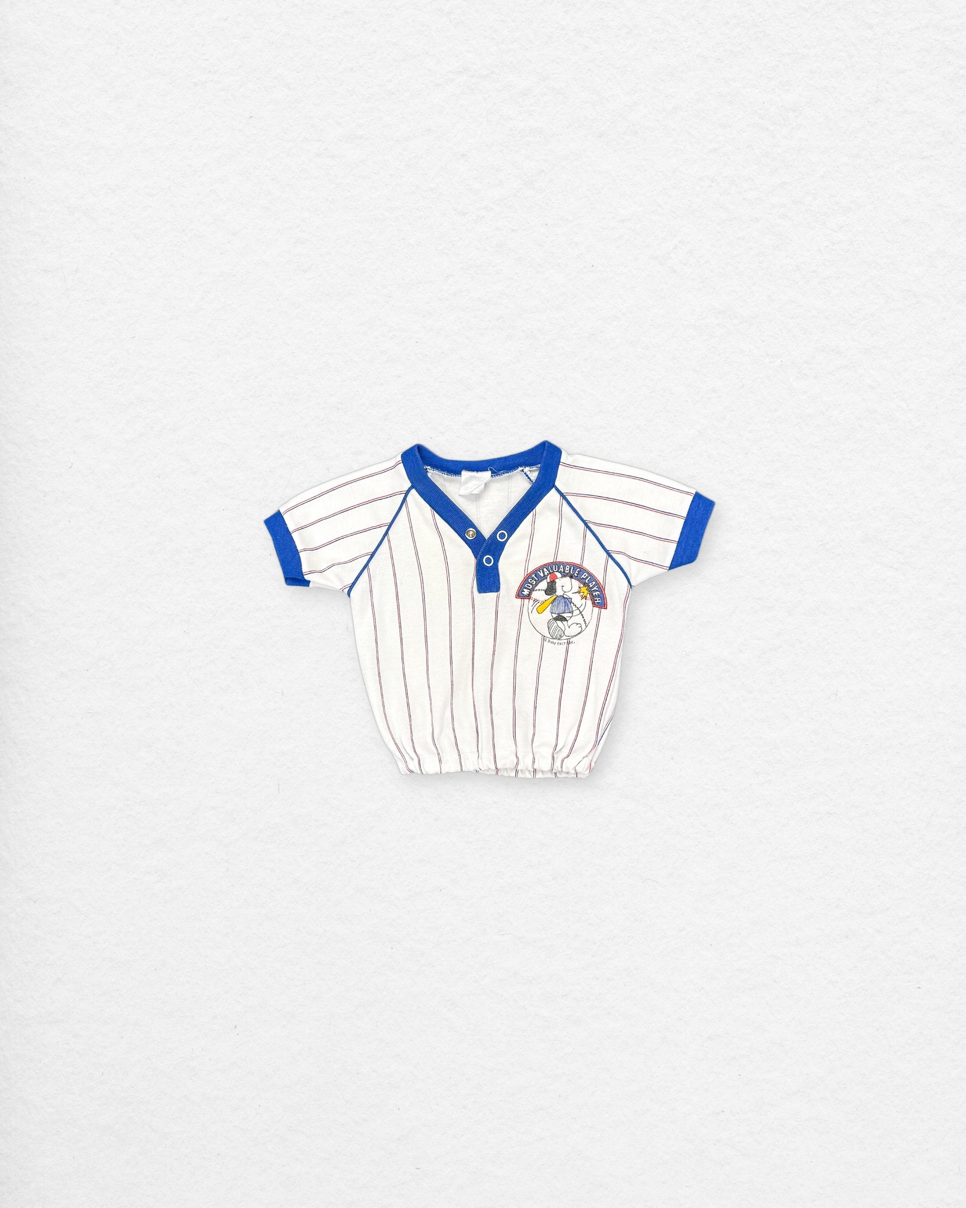 A playful vintage Snoopy tee from the 80's with a sporty twist. Featuring red pinstripes, bright blue trim, and a fun “Most Valuable Player” Snoopy baseball graphic, this piece is a nostalgic find perfect for little wardrobes. The snap neckline and elastic waist add comfort and style.