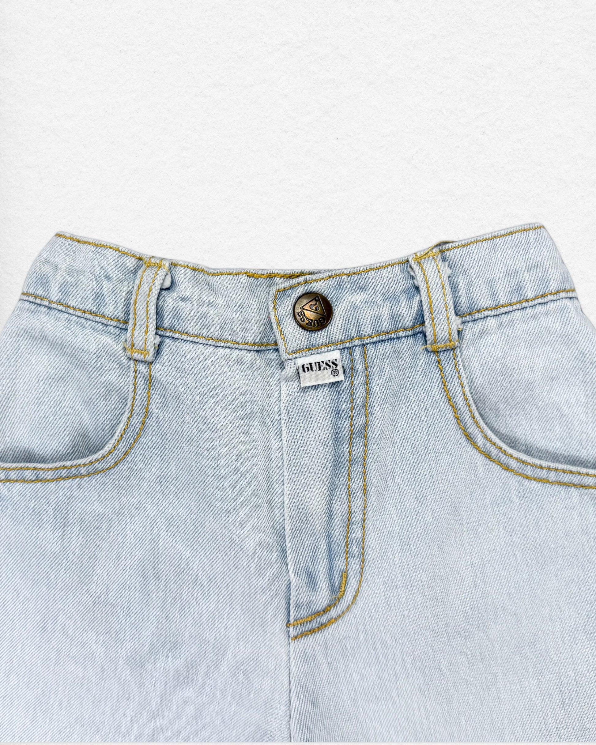 Light wash denim shorts from Baby Guess, featuring the iconic triangle patch on the back pocket. A staple piece from the 1990s Baby Guess line, known for quality construction and timeless style. These shorts have a straight cut with an elasticated waistband at the back for comfort and ease.