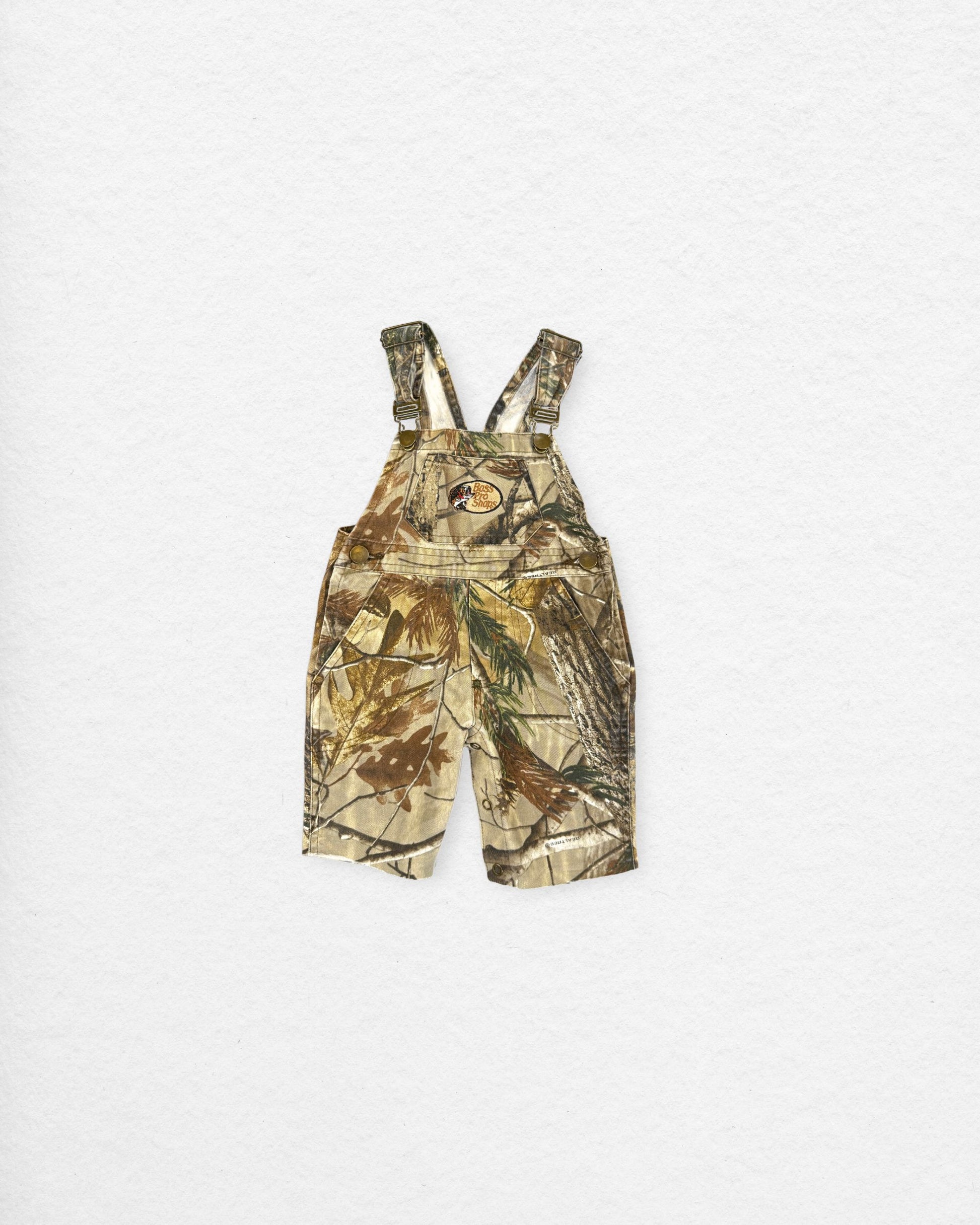 Classic Bass Pro Shops kids overalls featuring an all-over camouflage print with natural woodland tones. Made for durability and outdoor style, these overalls include the signature Bass Pro patch on the chest pocket, adjustable straps, and plenty of pocket storage. A rugged vintage piece perfect for little explorers.