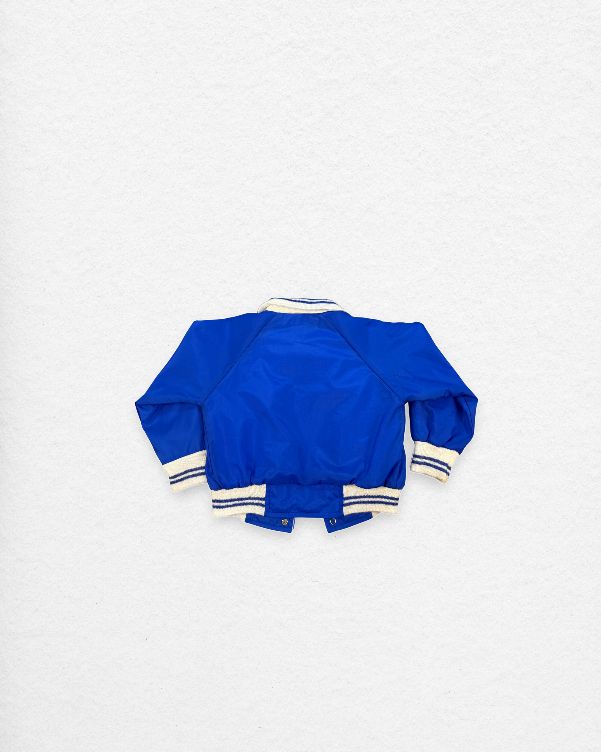 A bright royal blue vintage Dougies jacket with classic varsity style details. Features a soft contrast collar, striped rib trims and sturdy snap buttons. A great lightweight outer layer for everyday wear.