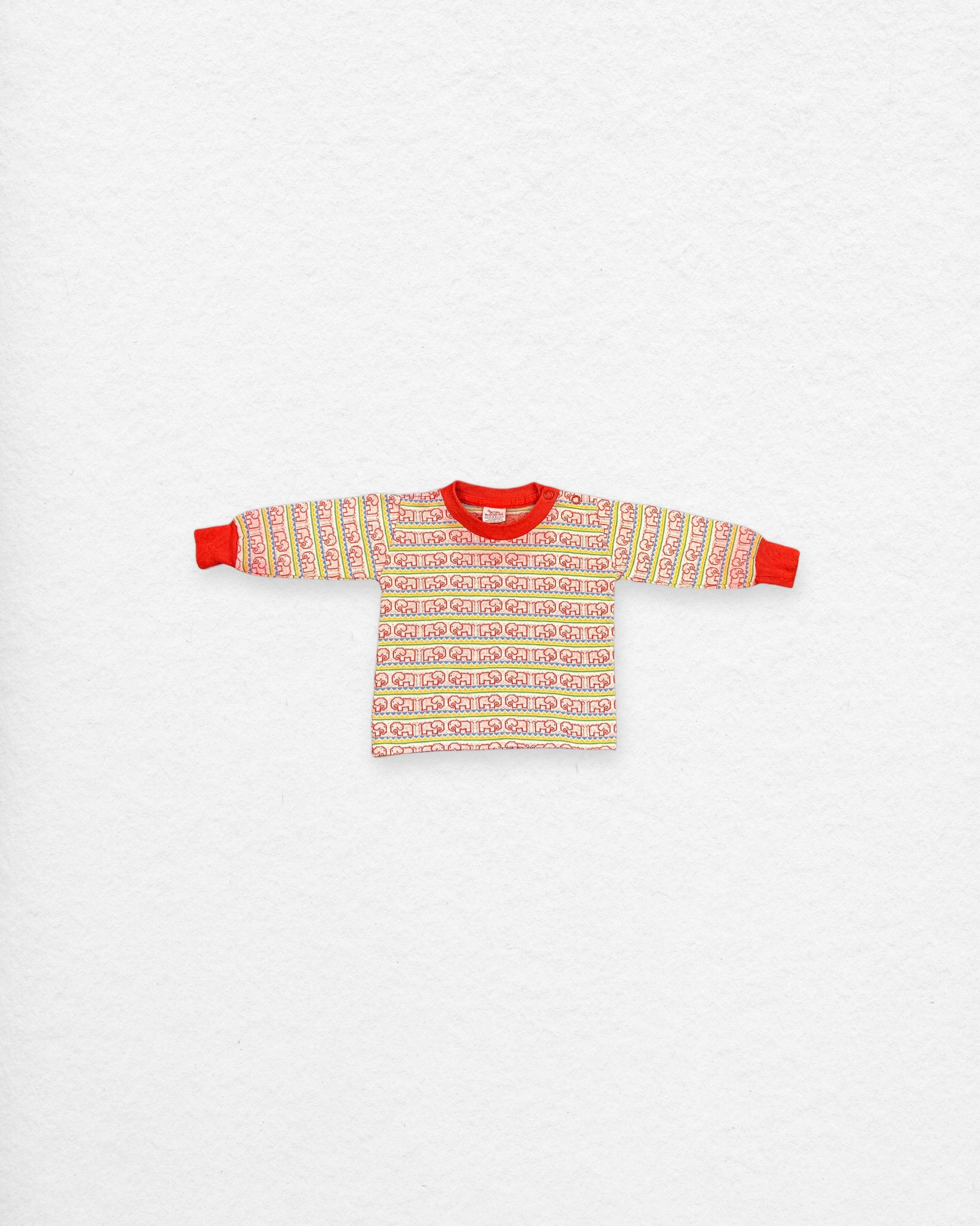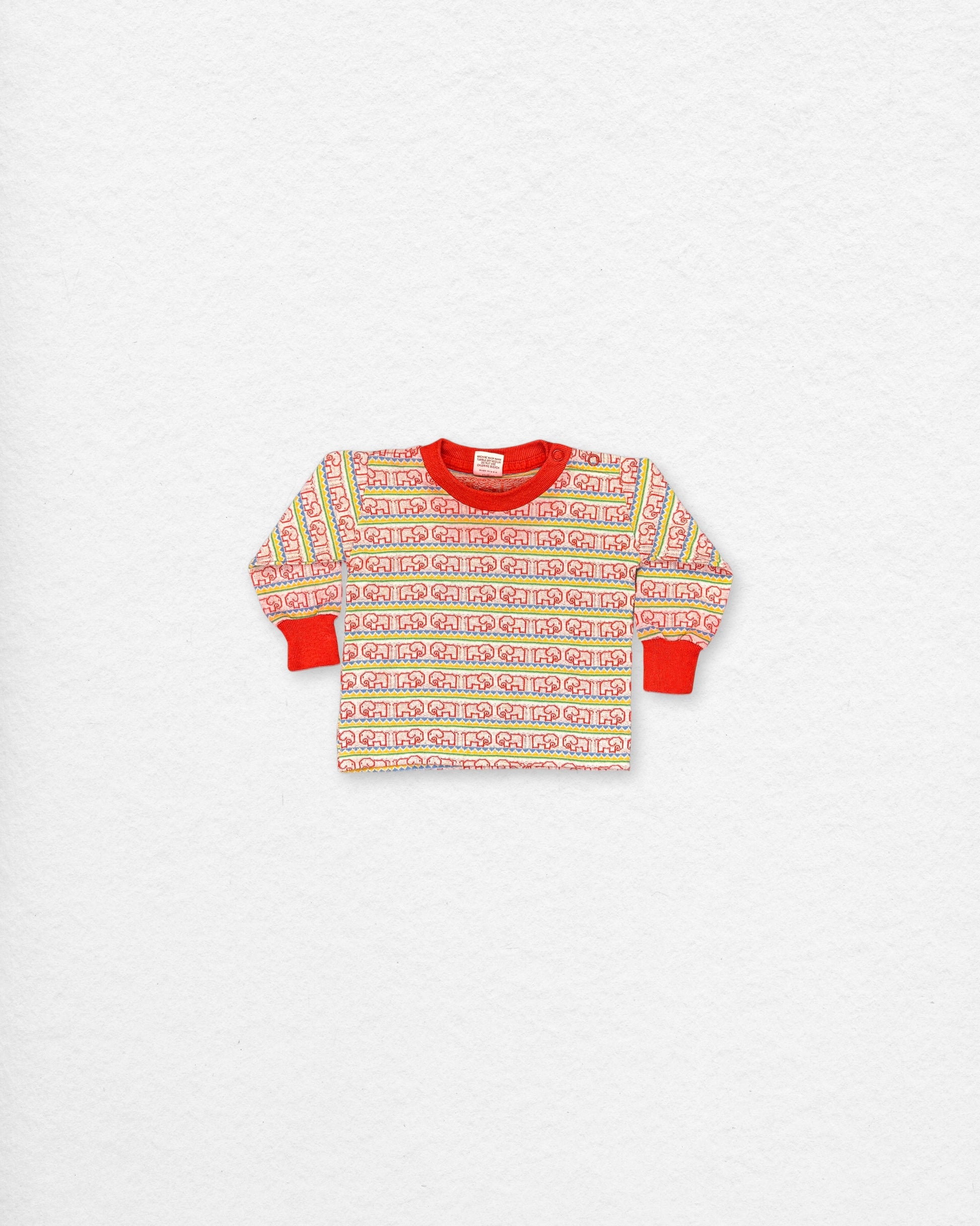A playful vintage Buster Brown long sleeve top featuring an all-over red elephant print with rainbow zigzag stripes. Finished with bright red ribbed cuffs and neckline. A fun and collectible piece of babywear from the late 1970s to early 1980s era.