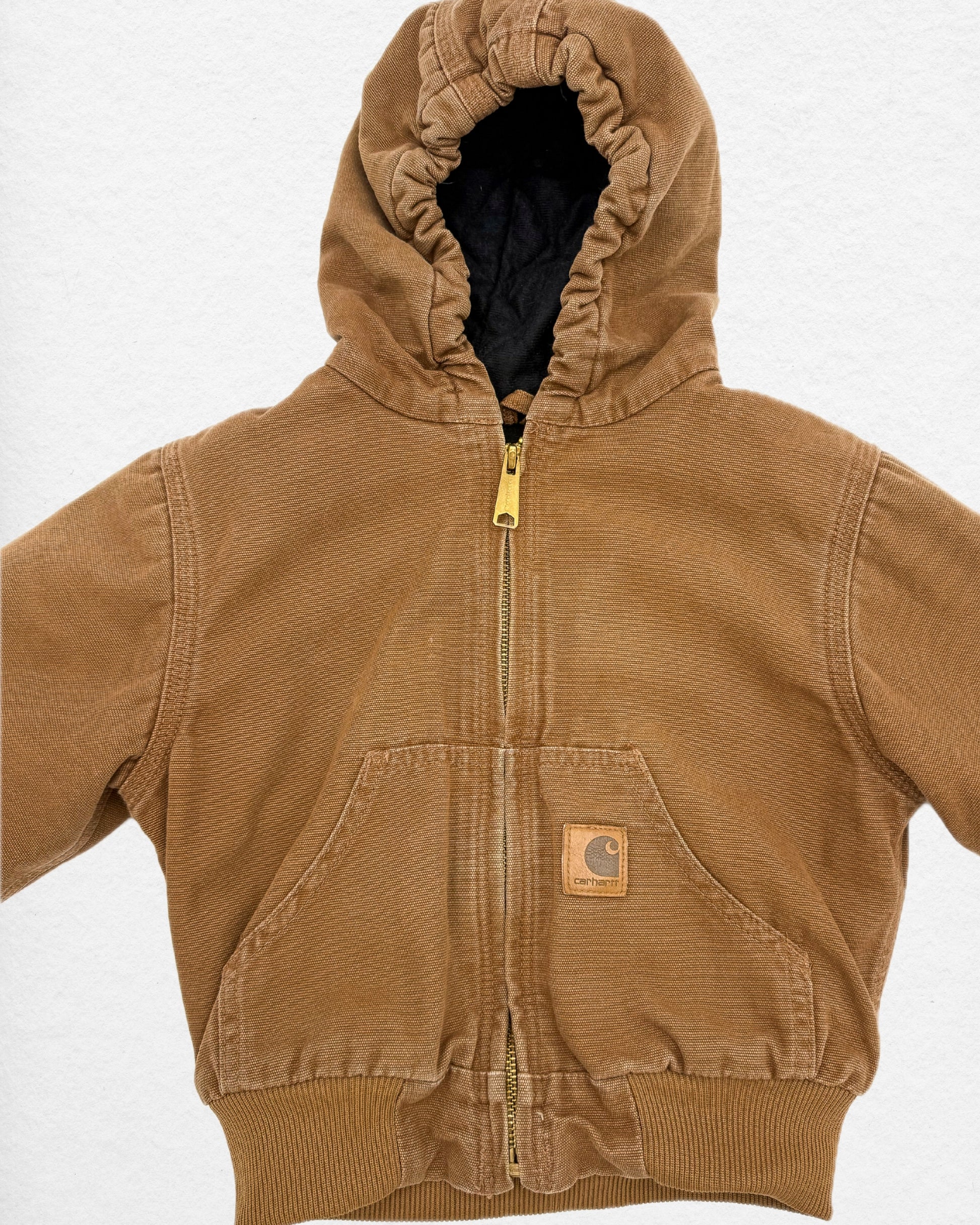 A timeless Carhartt classic in miniature. This vintage kids jacket features the brand’s signature duck canvas shell with a quilt-lined interior for warmth and durability. Designed with ribbed cuffs and hem for a snug fit, plus a sturdy brass zipper and hood for extra protection.