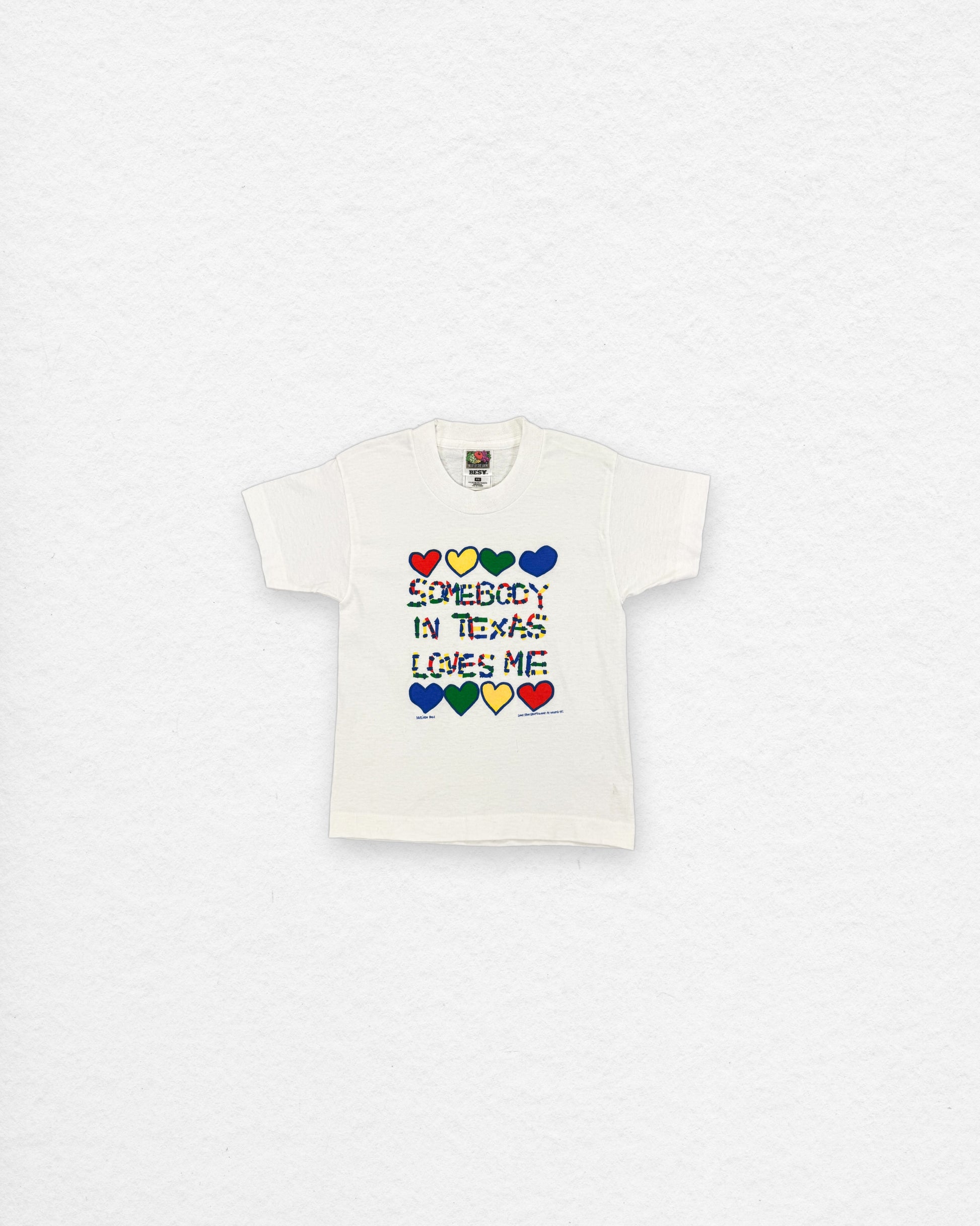 Classic 1990s Fruit of the Loom graphic tee featuring bold multicolour lettering with heart motifs reading “Somebody in Texas Loves Me.” Made in USA on a Fruit of the Loom BEST tag, this piece captures vintage Americana charm with a playful and nostalgic graphic.