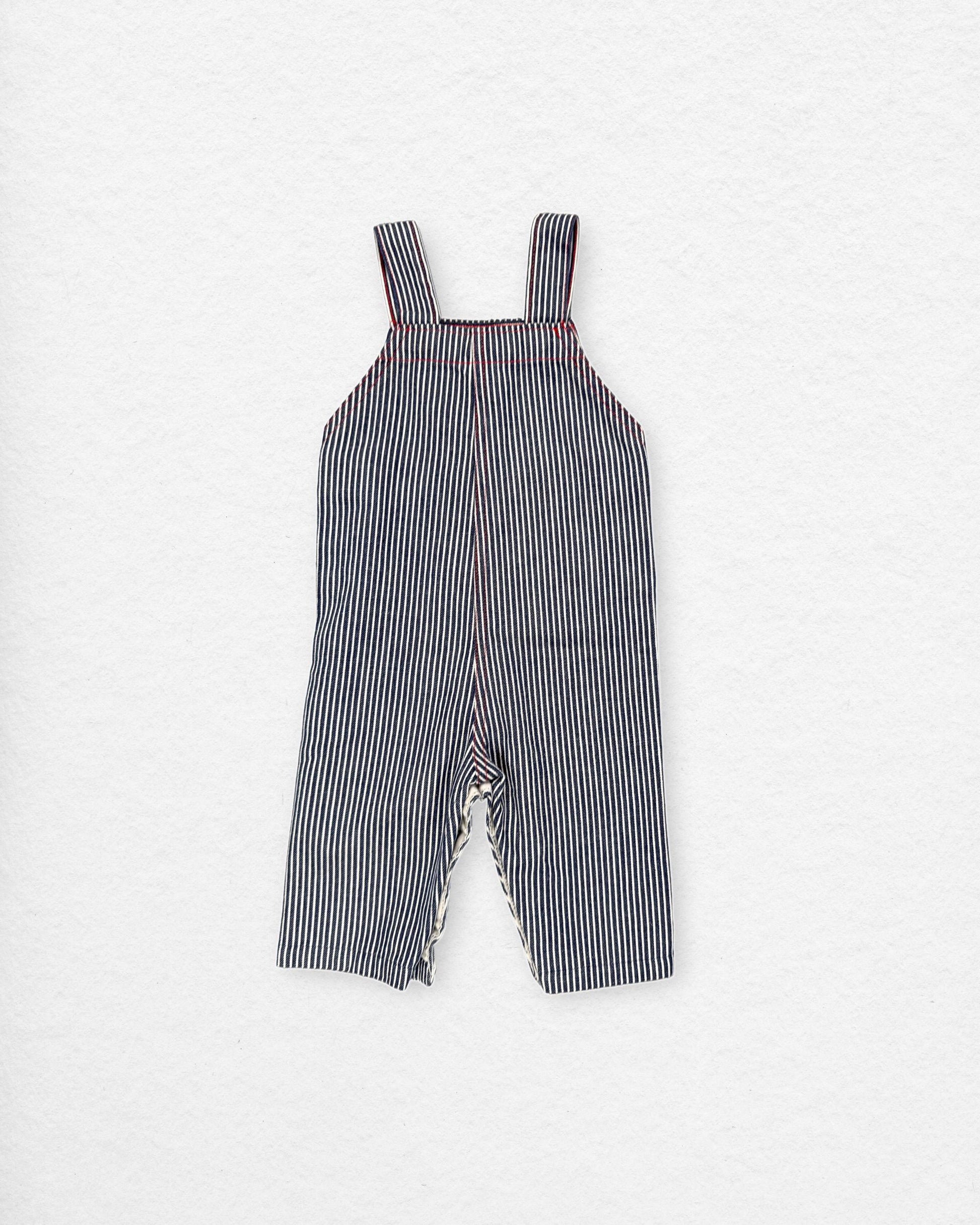 Classic railroad stripe overalls from Healthtex, featuring a navy and white pinstripe pattern with contrast red stitching and branded star buttons. Made in the USA, this piece is a beautiful example of early American children’s workwear design — durable, practical, and timelessly styled.