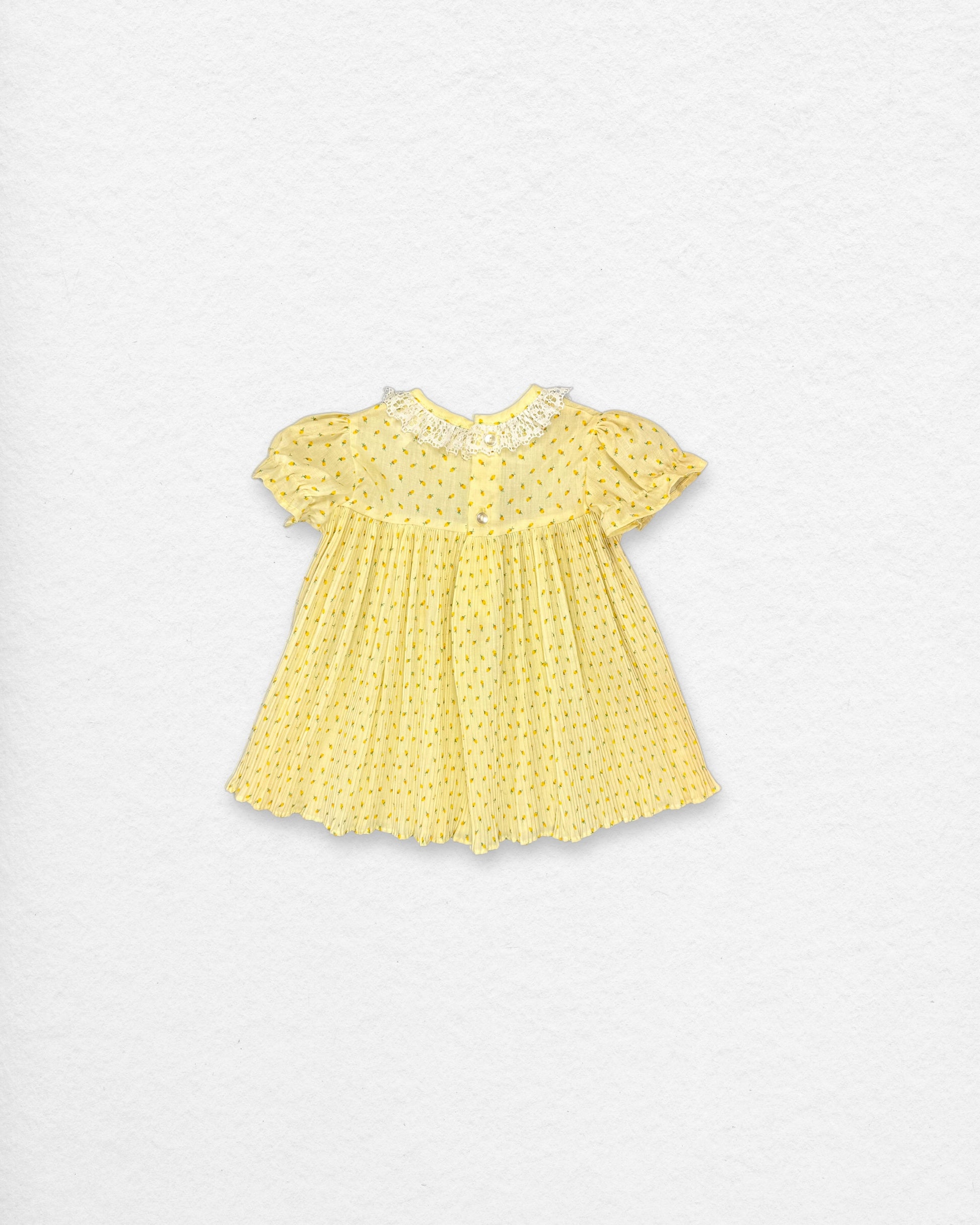 A delicate vintage JC Penney “Toddle Time” dress in a cheerful yellow with tiny floral print, lace-trimmed collar, and gathered puff sleeves. Finished with a yellow velvet ribbon tie and full pleated skirt, this piece is a sweet classic from mid-century kidswear.