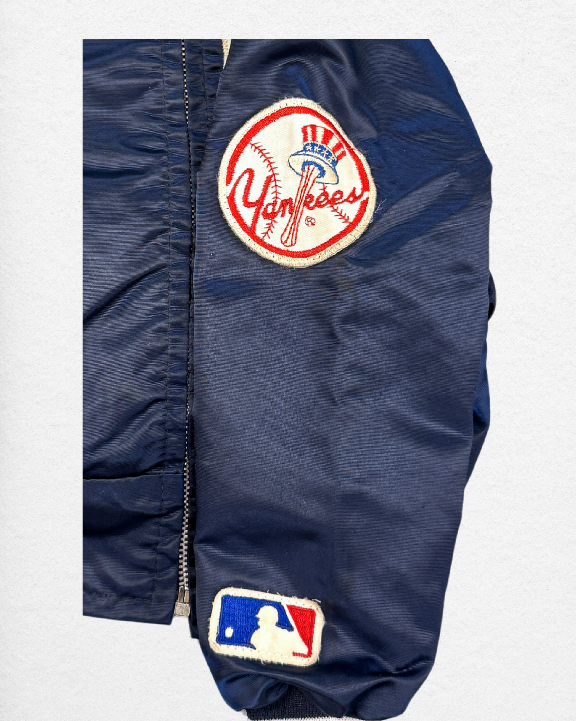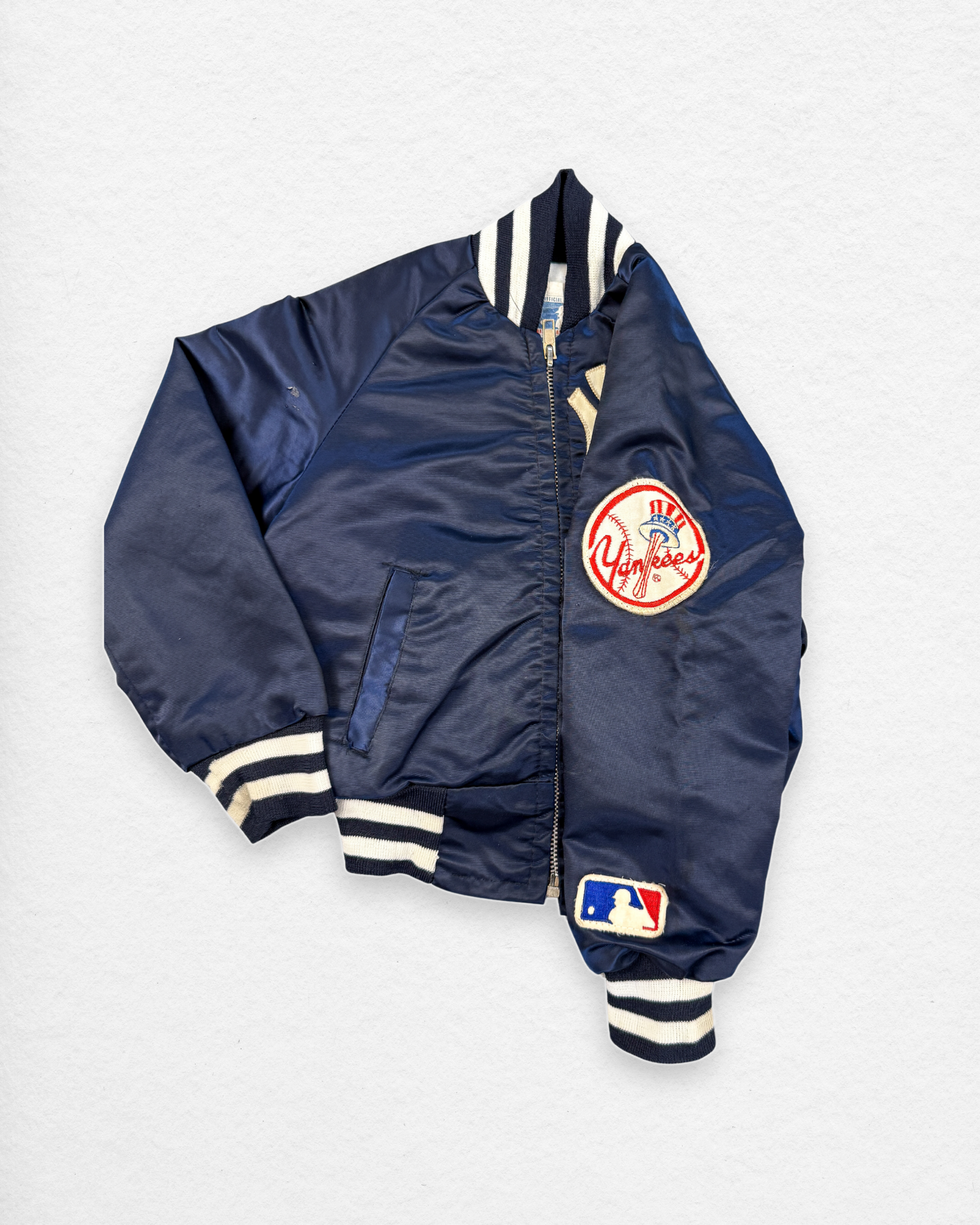 A rare early–mid 1980s New York Yankees jacket in classic navy, finished with bold embroidered patches, striped rib trims and a soft quilted lining. A standout collectible piece for little wardrobes.