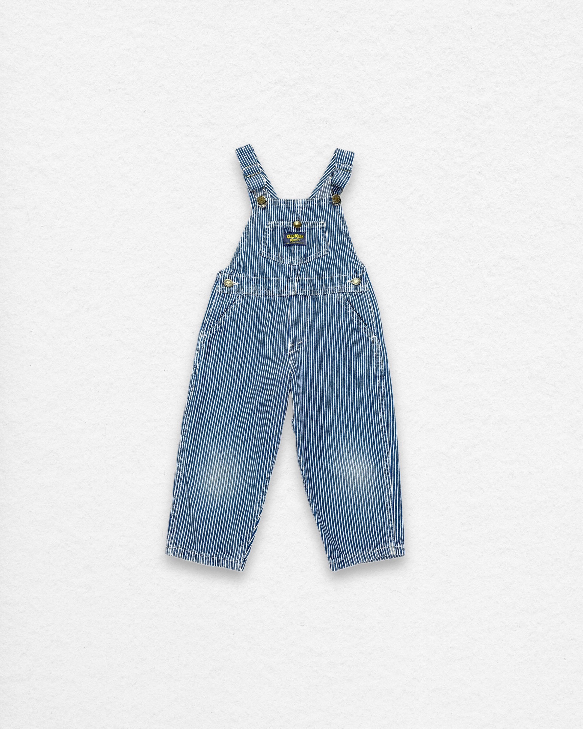 Classic vintage OshKosh B’gosh hickory stripe overalls, crafted from durable 100% cotton denim. Featuring adjustable straps, metal button hardware, and signature OshKosh logo patch on the front bib. A timeless American workwear-inspired style, downsized for little ones.
