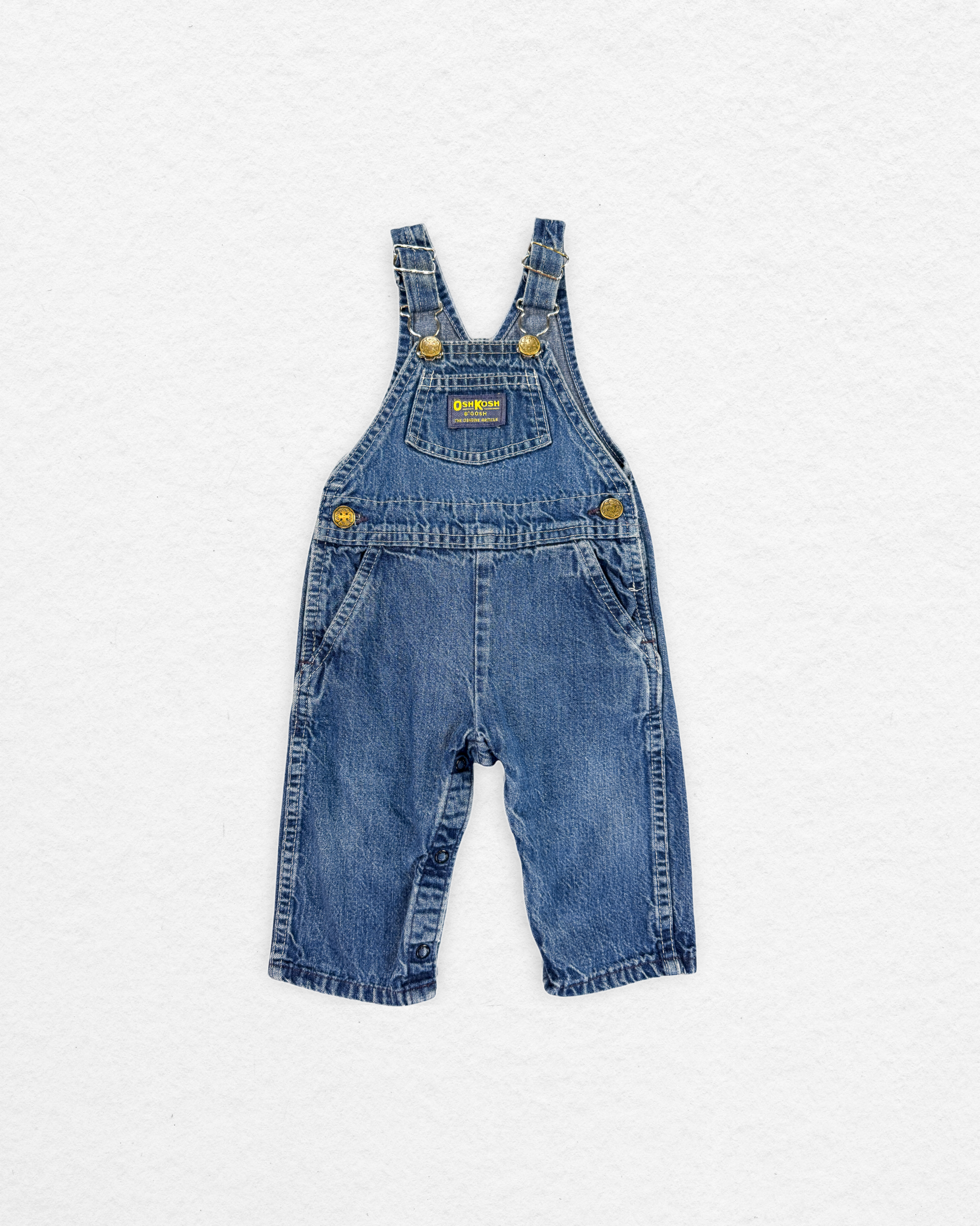 Vintage OshKosh overalls in classic denim subtle fading and the classic yellow OshKosh logo patch on the chest. A timeless baby essential with adjustable straps and durable metal hardware, perfect for everyday wear.