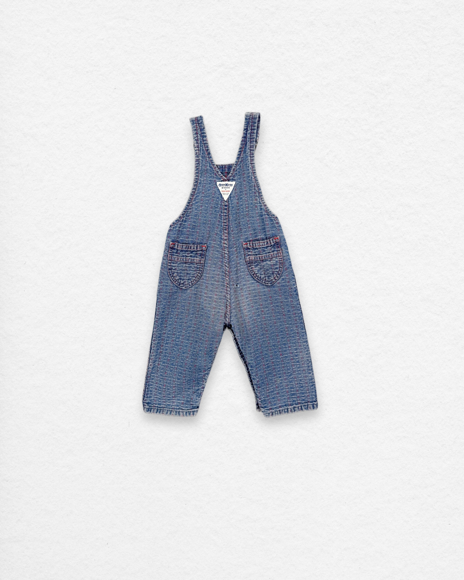 1990's Era Classic vintage OshKosh B’gosh striped denim overalls in blue with subtle red thread detail. Featuring adjustable shoulder straps, branded hardware, and multiple pockets. A timeless workwear-inspired piece scaled down for little ones.