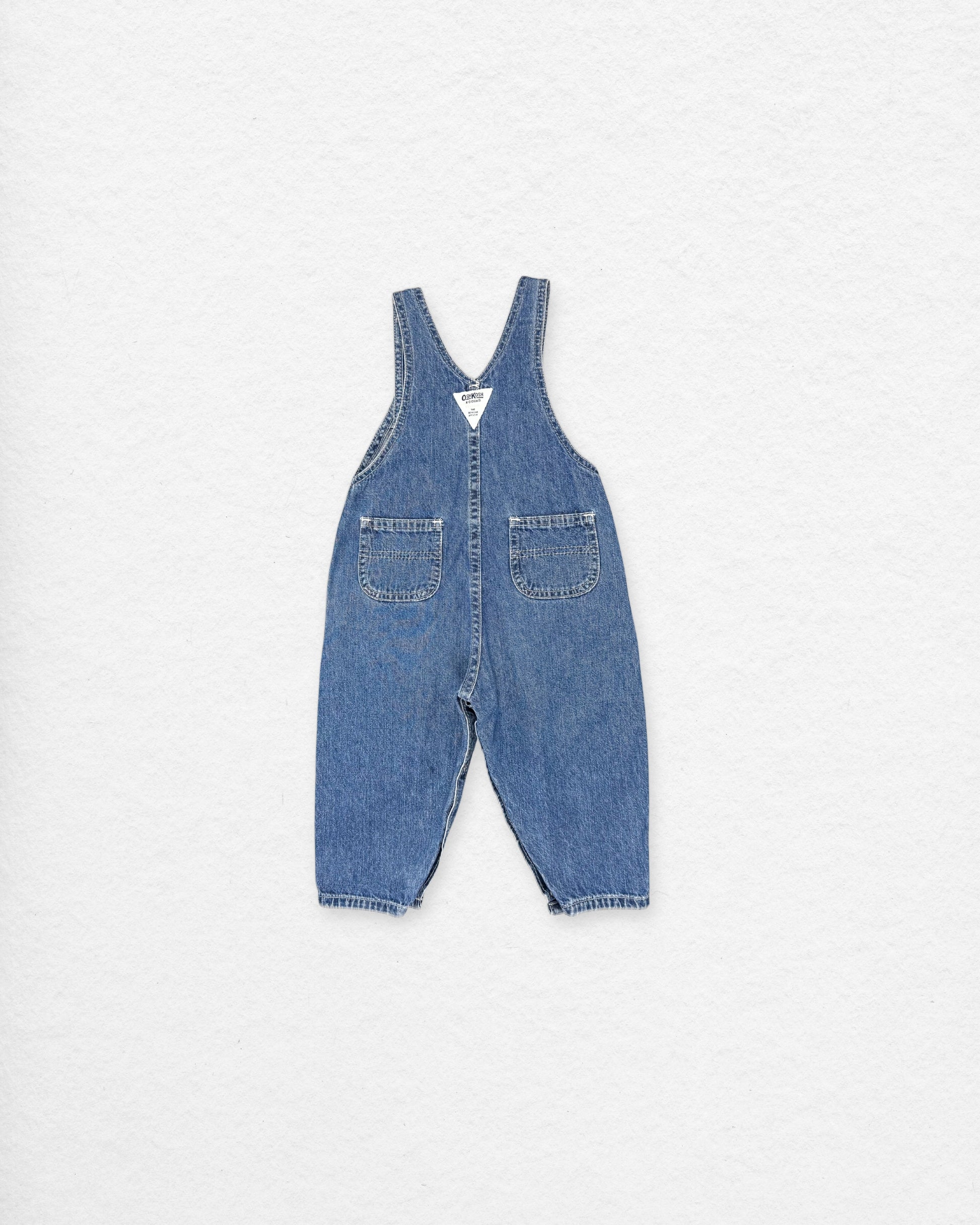 Classic OshKosh B’gosh denim overalls in medium wash cotton, featuring adjustable straps, branded patch, and side button closures. A sturdy and timeless piece of kidswear made for play and durability.