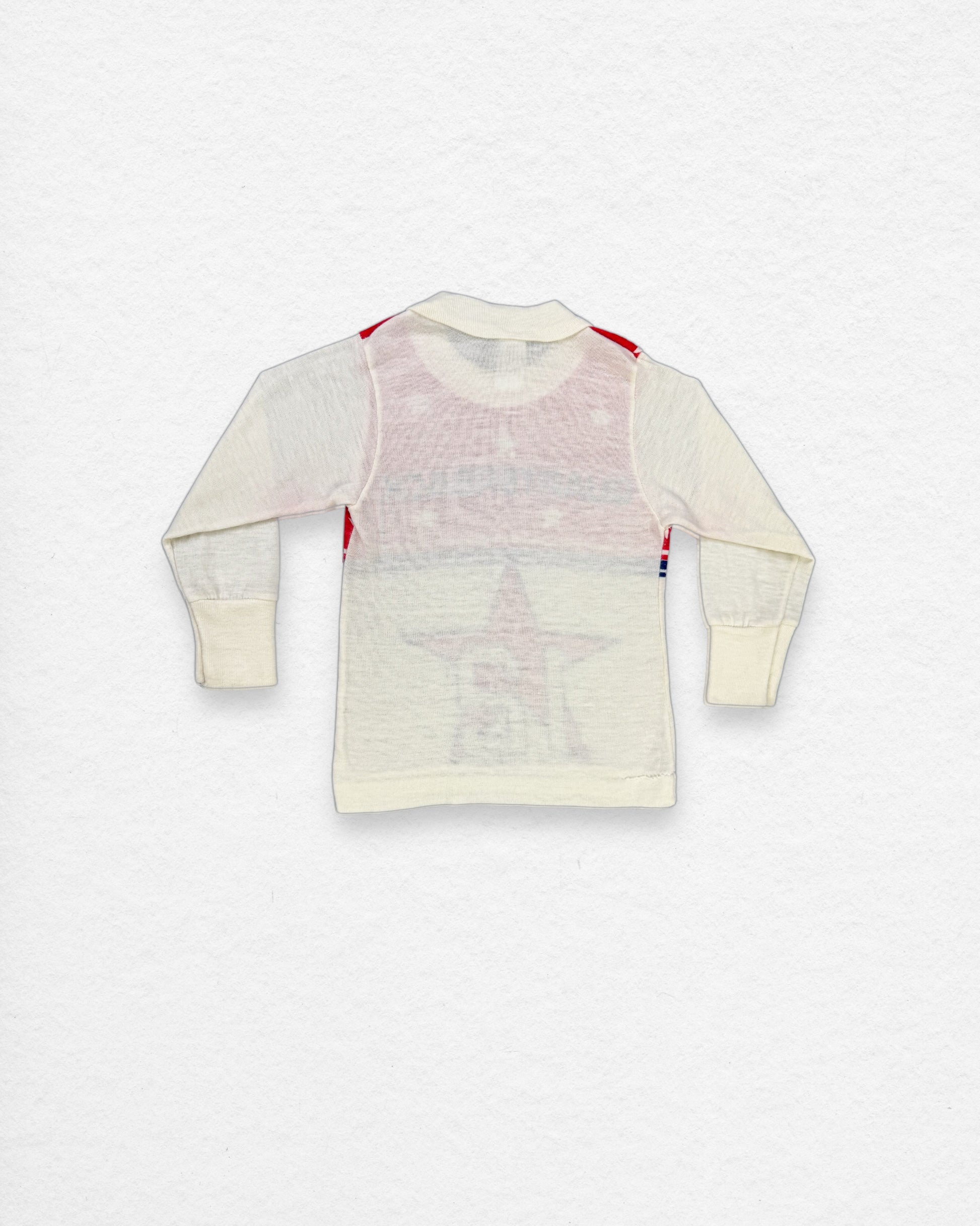 A standout vintage kids piece from the 1980's. This long sleeve features bold red, white, and navy football-inspired graphics. With “Quarterback” text across the chest, star details, and a large “12” print, this piece has a strong retro sports feel. Perfect for layering or wearing as a statement top.