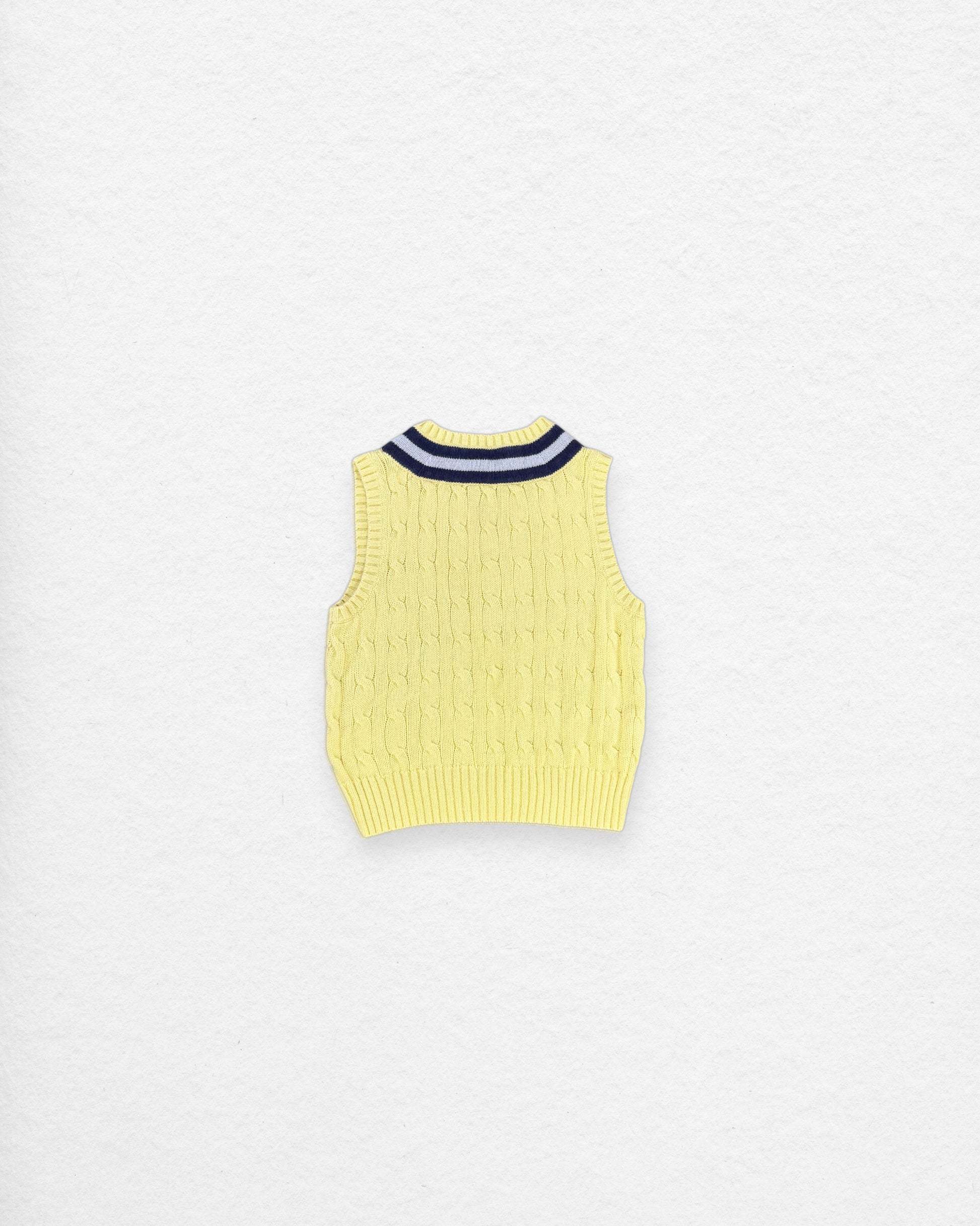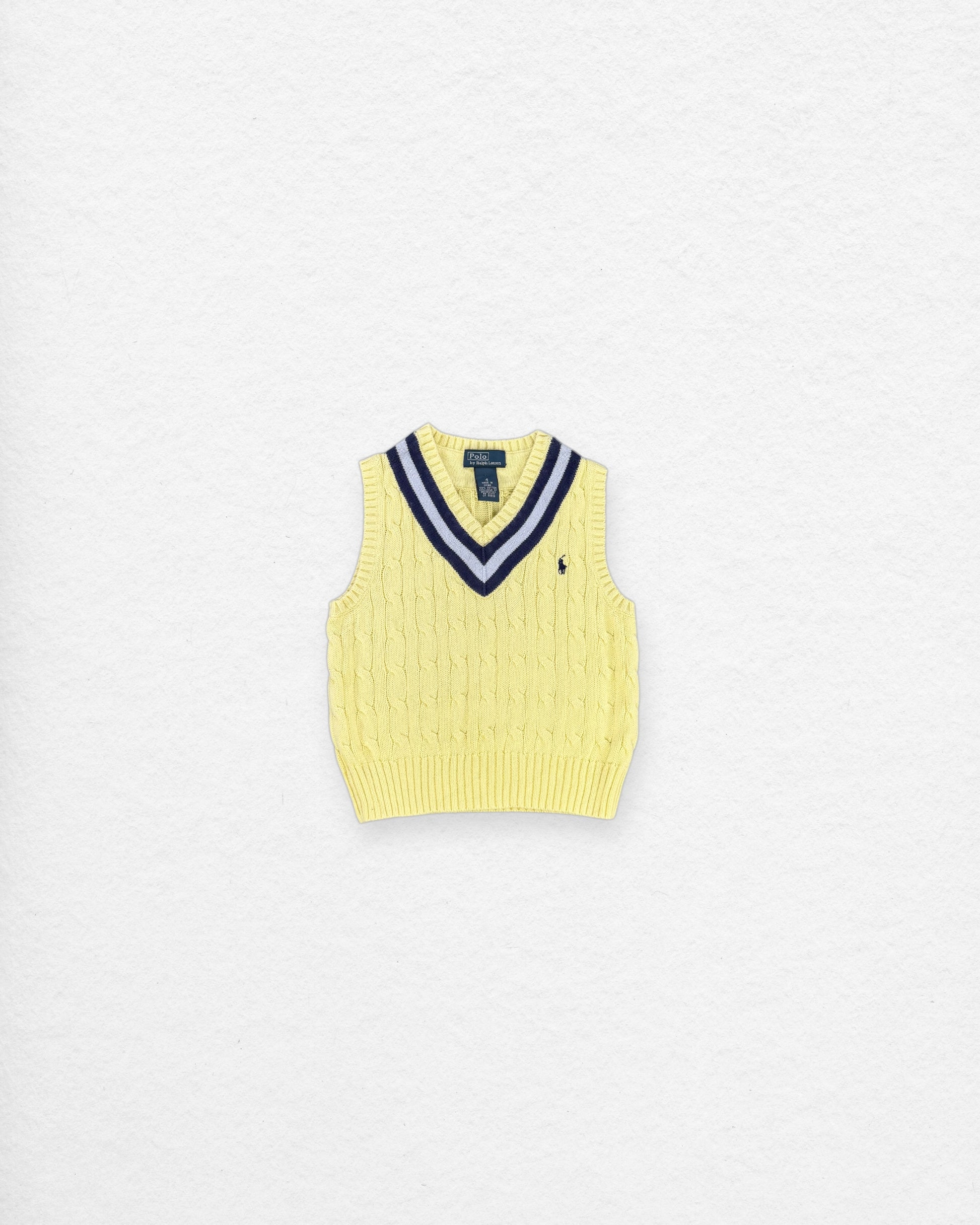 A timeless Ralph Lauren children’s piece with a preppy twist. This sleeveless cable knit vest features a soft pastel yellow body with navy striped V-neck trim and the iconic embroidered pony logo at the chest. A classic layering piece that embodies Ralph Lauren’s heritage style, perfect for both casual and dressed-up looks.