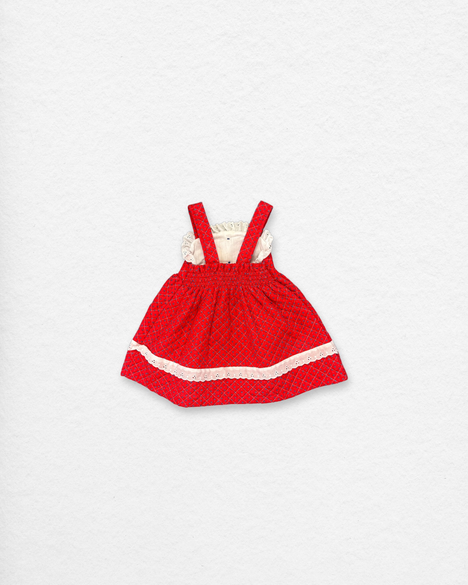 A charming vintage red sundress featuring delicate eyelet lace trim and a navy ribbon bow. The quilted diamond print fabric, cream frilled neckline, and gathered waist create a timeless silhouette reminiscent of classic 1970s–80s children’s wear. A beautiful collectible piece that balances sweet nostalgia with standout detail.