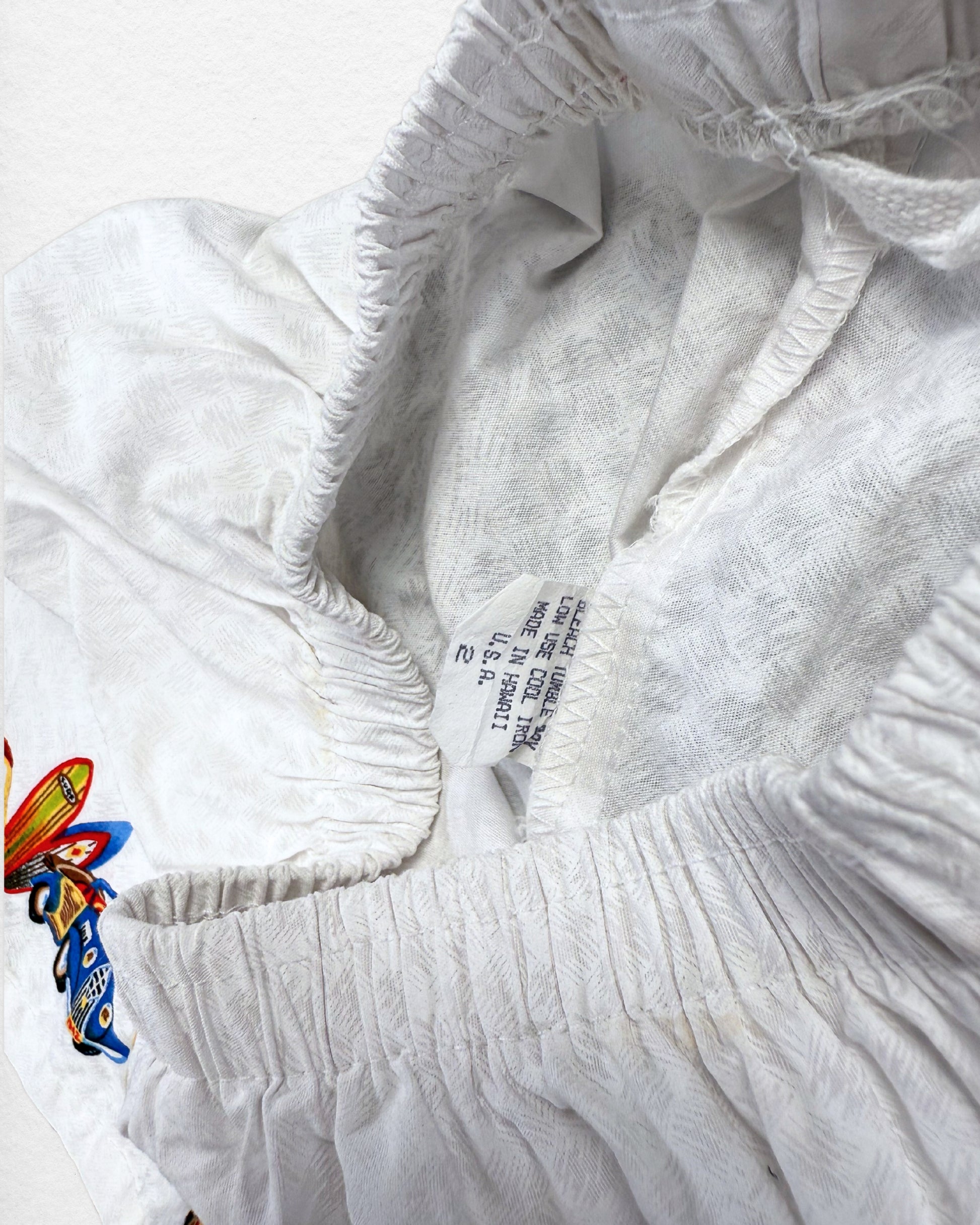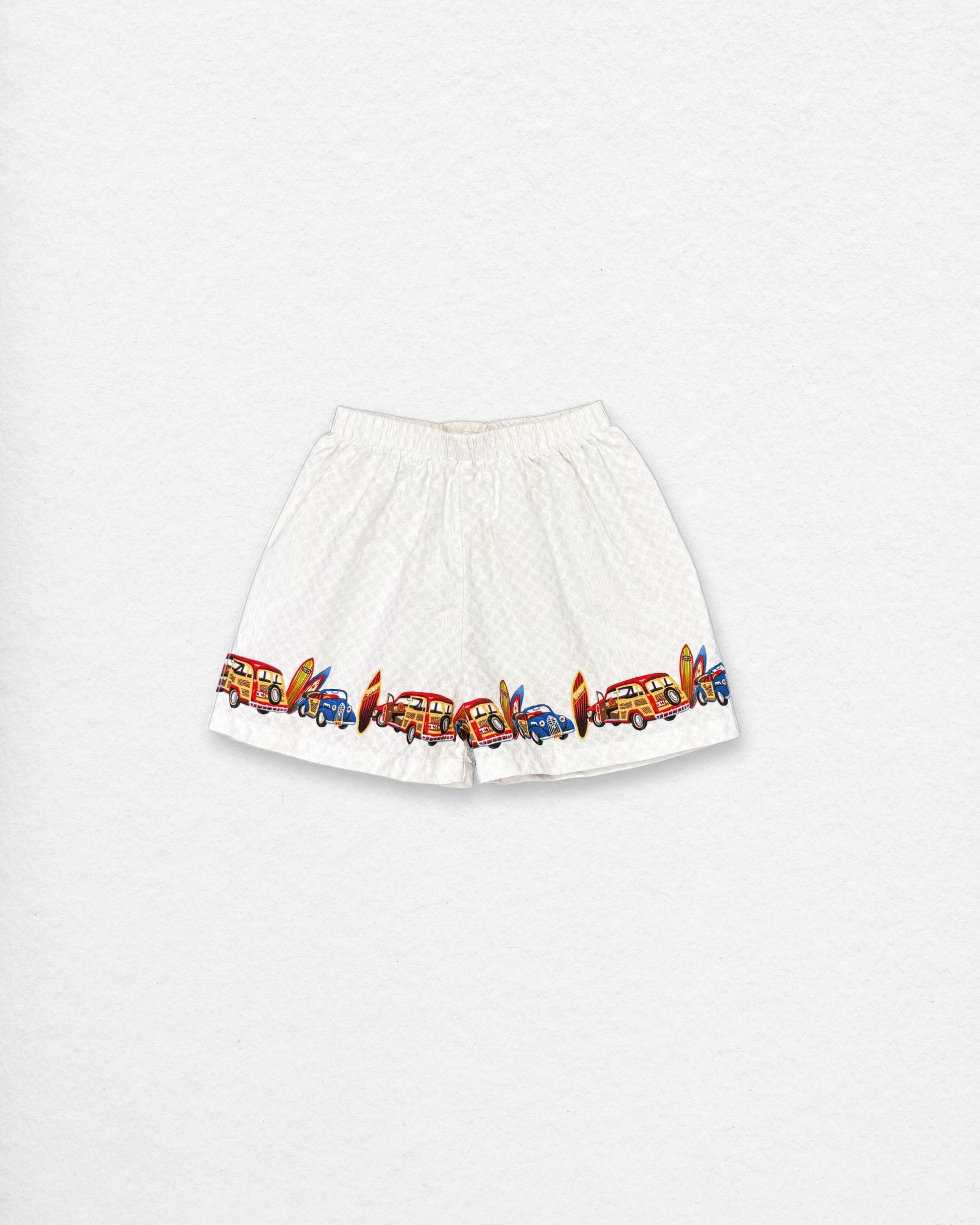 Playful vintage shorts featuring a fun surf van and surfboard border print along the hem. Made from soft, lightweight cotton with a subtle textured pattern and an easy elastic waistband. Perfect for warm weather, these capture a nostalgic coastal feel that’s both retro and wearable.