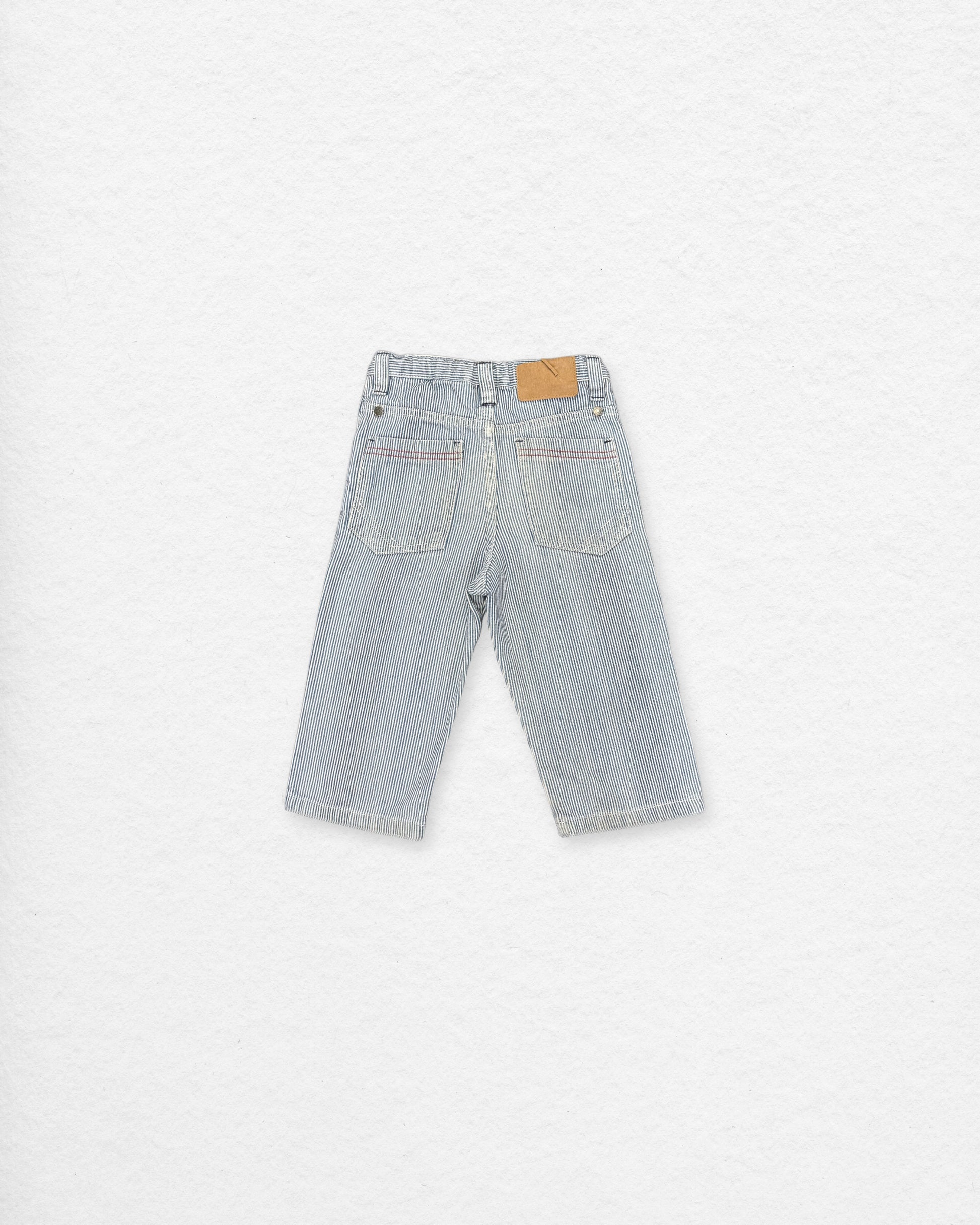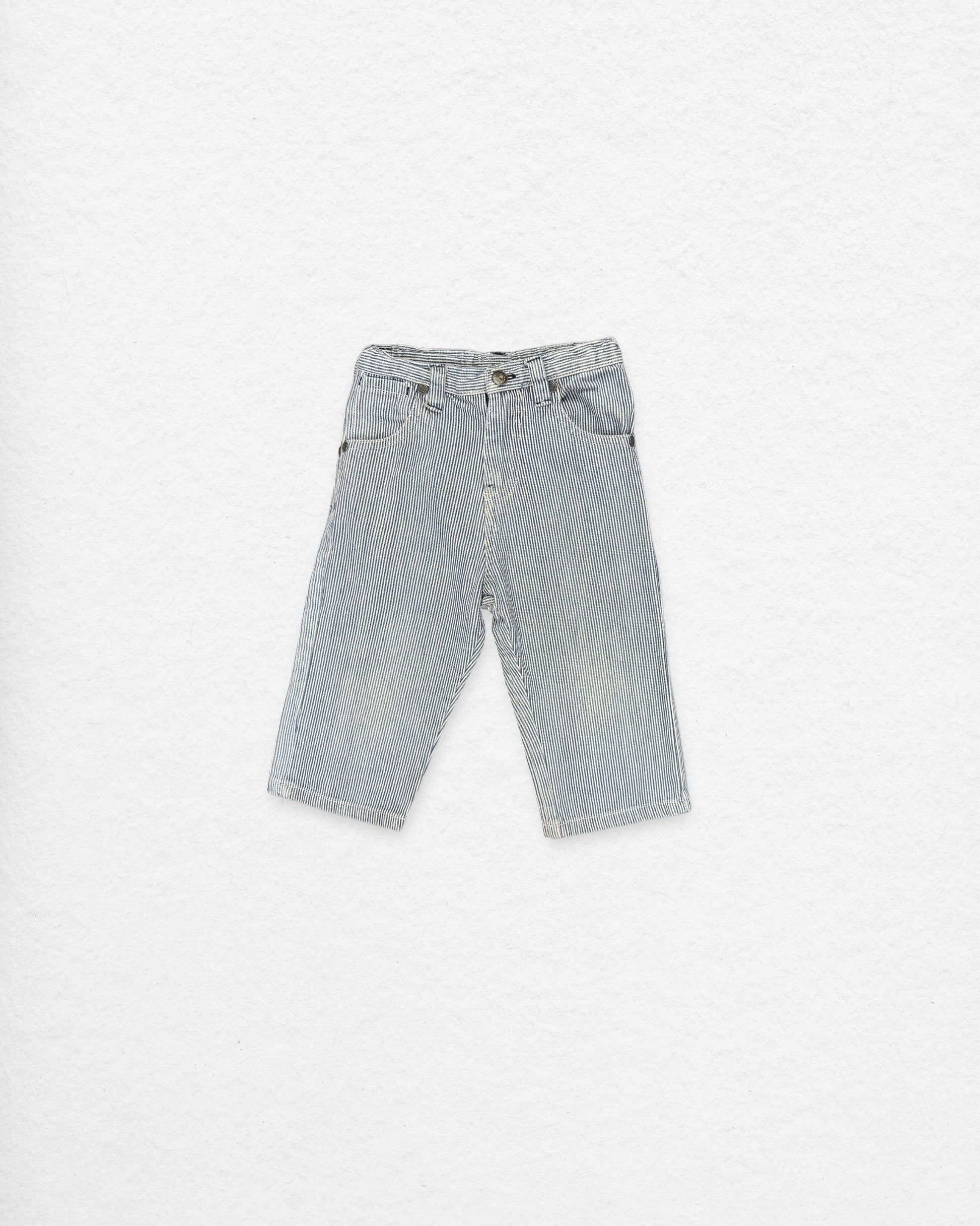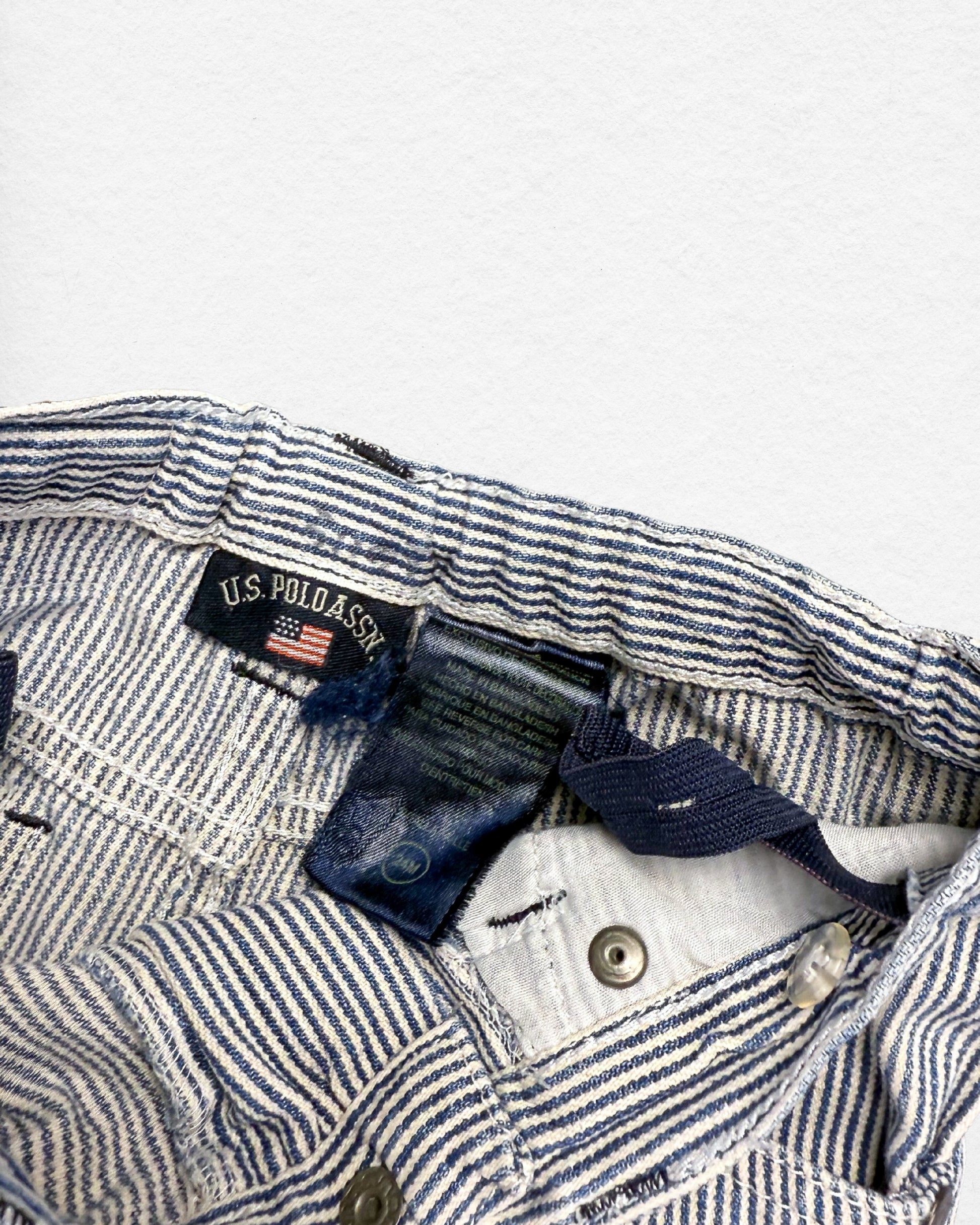 A pair of vintage U.S. Polo Assn. pants in a blue-and-white railroad stripe pattern. Features a straight leg cut, belt loops, and classic five-pocket styling. Durable cotton fabric with a retro Americana workwear look, perfect for everyday wear or styled with vintage tops.
