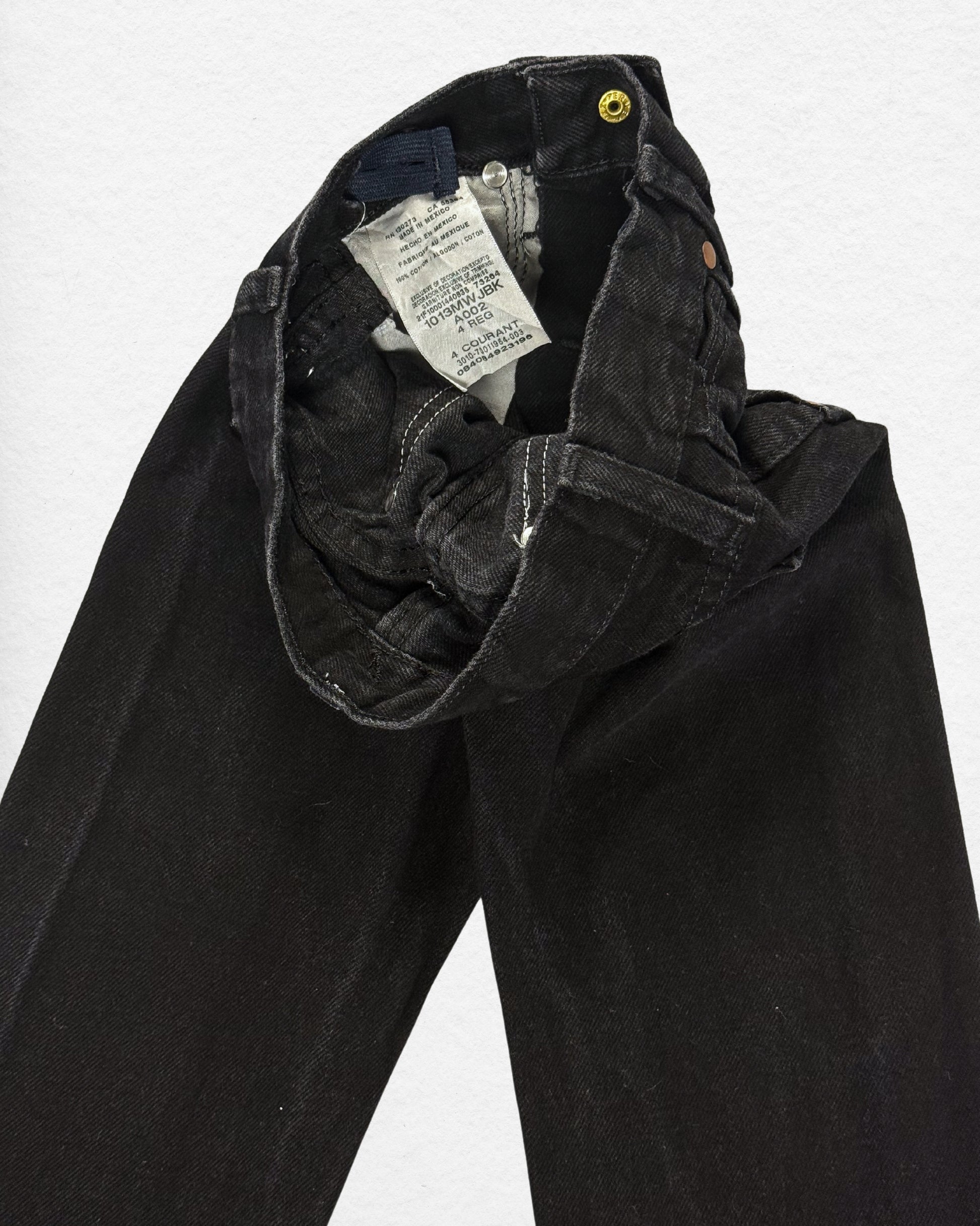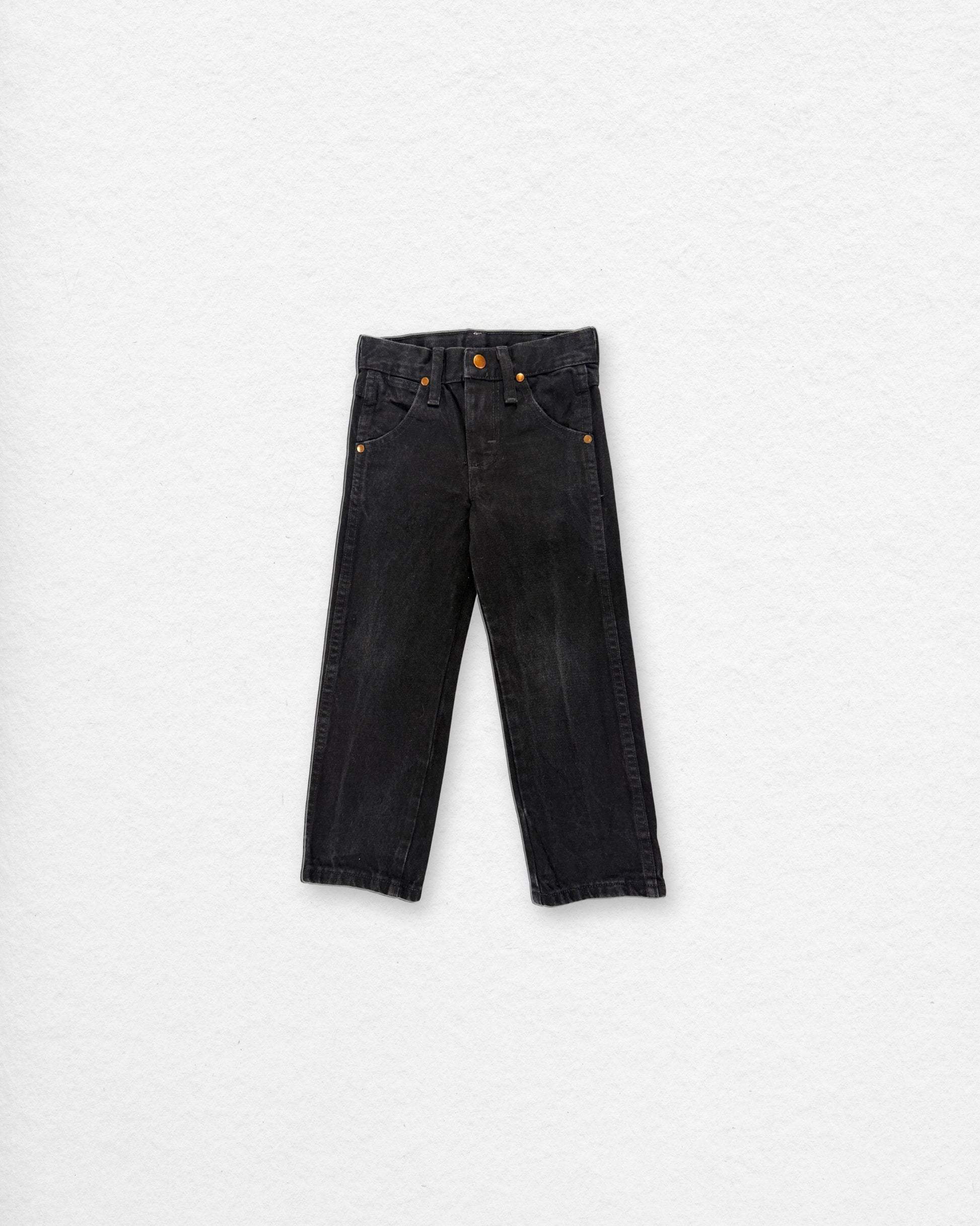 Classic vintage Wrangler jeans in a deep black wash, cut from sturdy 100% cotton denim. Features the signature “W” stitched back pockets, leather logo patch, copper rivets, and belt loops. A timeless Wrangler piece from the late 90s/early 2000s era, built to last.