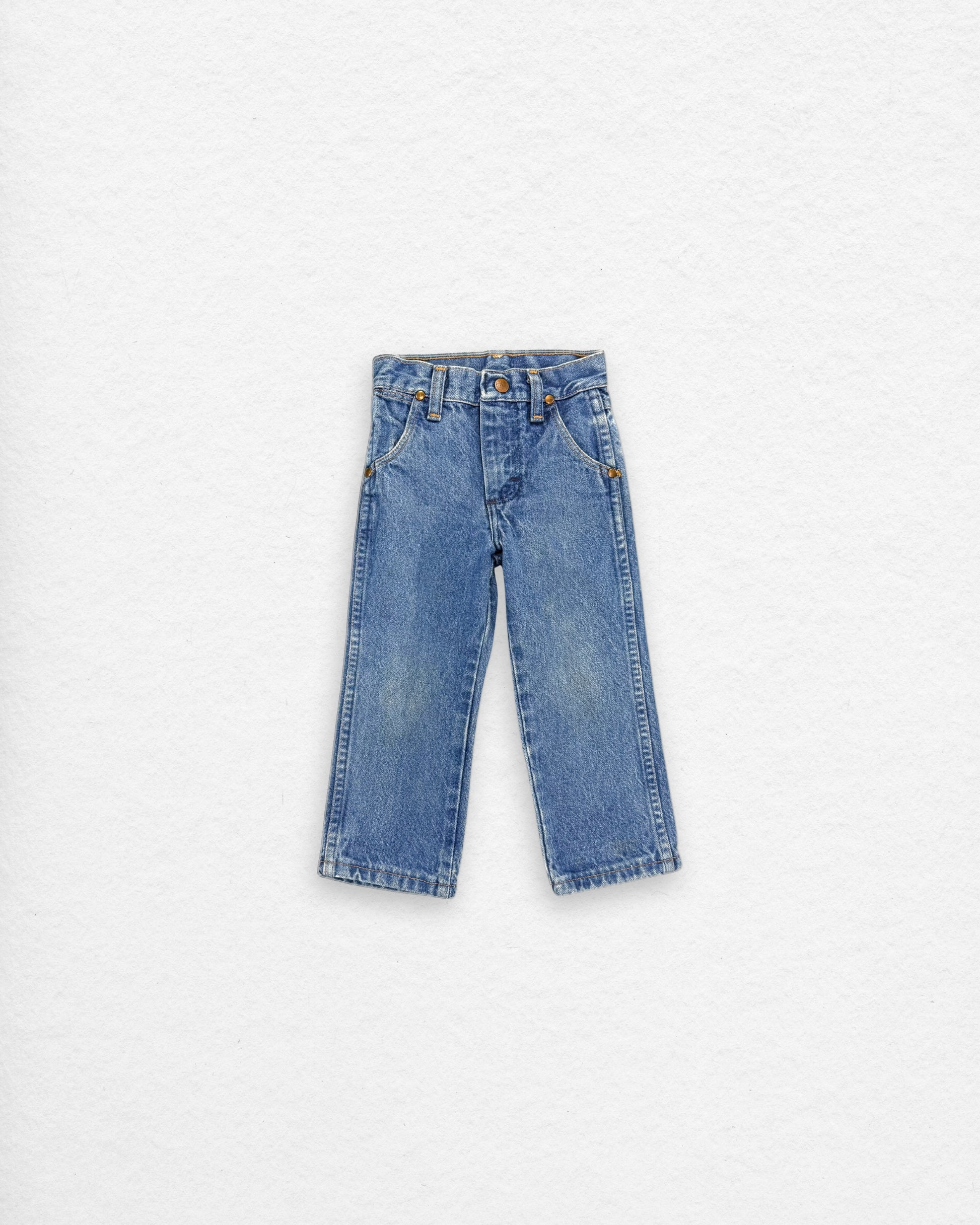 Classic vintage Wrangler kids’ jeans in durable blue denim. These feature Wrangler’s signature “W” stitched back pockets, rivet detailing, and leather logo patch. A timeless staple with authentic 90s workwear style for little ones.